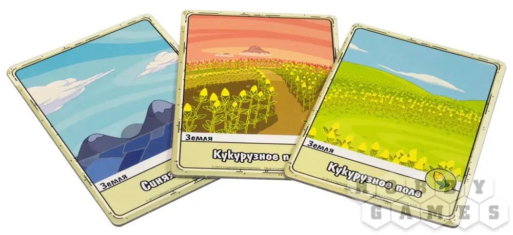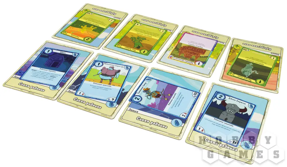 Как говорилось выше, игра проходит на специальном поле, которое выстраивается перед боем. Планшеты земель обоих игроков выкладываются друг напротив друга так, что получается поле 2х4 клетки. Карты земель одновременно являются ресурсами для оплаты карт и ячейками для выкладывания ваших существ или строений. Положение существ крайне важно, нападать друг на друга они могут только в том случае, если находят в одной области, то есть друг напротив друга. Это общее правило распространяется и на другие элементы игры.