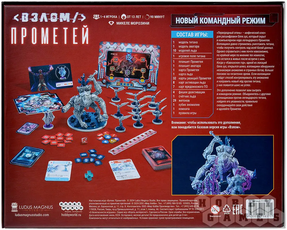 "Взлом: Прометей" – это дополнение, которое совершенно меняет уже ставший привычным соревновательный ход "Взлома" и открывает вам кооперативный режим. Теперь у вас появится возможность и даже необходимость сплотиться со своими друзьями и действовать сообща. Как и в базовой версии, у каждого из вас будет свой детализированный 3D-аватар и карта взломщика. Помимо главного врага Прометея, представленного в виде роскошной фигурки, вам по-прежнему придётся сражаться с более слабыми врагами – его прихвостнями. Однако правильная стратегия и грамотное распределение сил в команде позволят вам с лёгкостью устранить всех, кто окажется на вашем пути к главной цели – "Первородному огню", который хранится в компьютерном коде Прометея и является ключом к расшифровке базы данных. Скорее объединитесь с союзниками и доведите свою миссию до конца!