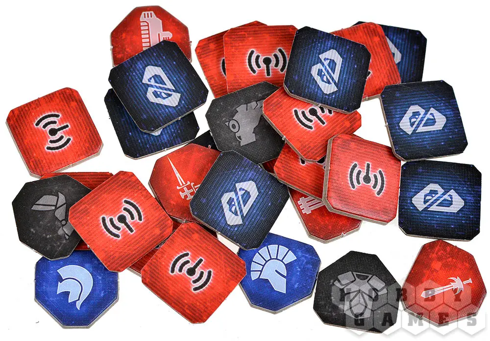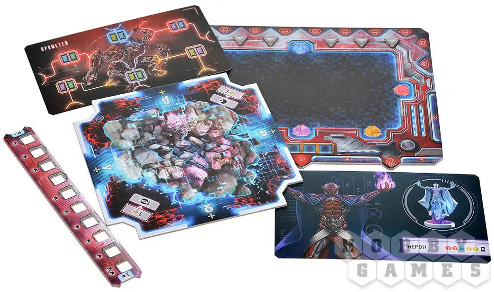 Уделим особое внимание фазе действий, так как это основная часть вашего хода. Вам доступны следующие варианты: перемещение с потенциальной возможностью раскрыть и активировать новую комнату, атака, экранирование (то есть защита), конфигурация (оптимизация ресурсов), заражение (размещение жетонов вирусов, которых у вас ограниченное количество, в комнатах базы данных; их количество повышает уровень вашей угрозы), выход (отключение аватара от системы), переподключение и улучшение (изменение характеристик с помощью соответствующих фишек и деки). Количество ваших действий ограничено значением кликов в слоте процессора, но тип вы можете выбирать сами.