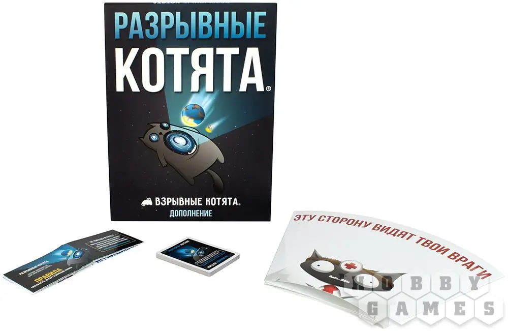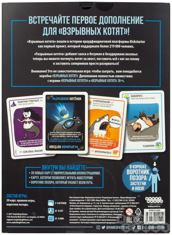 "Разрывные котята" – это первое дополнение к "Взрывным котятам", которое подойдёт и для скабрёзной 18+ версии. С ним вы сможете играть в любимую карточную игру вшестером (в базовых версиях максимум игроков – пять), а уже знакомая колода разнообразится и начнёт благоухать весенней свежестью (или запахом напалма поутру).