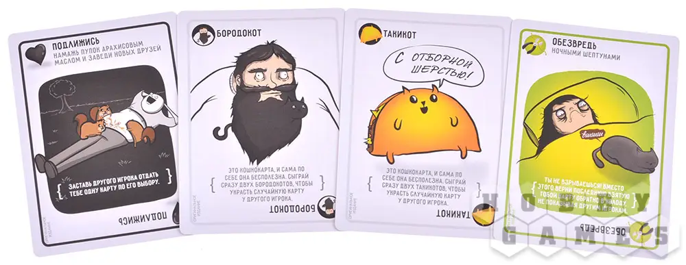 Кошкокарты! Сами по себе бесполезные, если бы не ещё одно правило комбинаций. Например, разыграв две любые одинаковые карты, вы можете забрать карту у противника. За три одинаковые карты вы сможете выбрать определённую карту у врага. А за пять разных – можно покопаться в стопке сброса и забрать себе одну любую карту