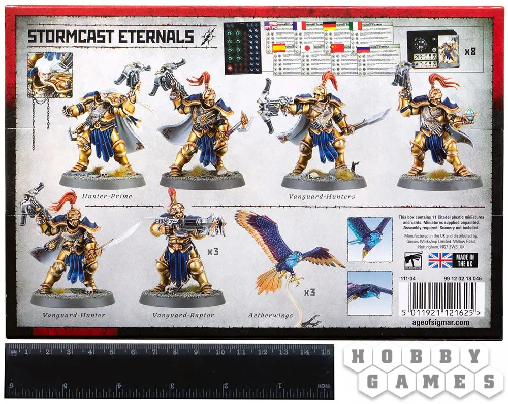 Этот набор содержит одиннадцать детализированных пластиковых миниатюр, включая: три Раптора Авангарда (Vanguard-Raptors), три Эфирокрыла (Aetherwings) и пять Охотников Авангарда (Vanguard-Hunters). Внутри коробки также находится специальная карта способностей, на обратной стороне которой изображены все виды бойцов. В дополнение к этому вы получите карты для двенадцати видов воинов, а также два листа с тематическими жетонами для отслеживания активаций, эффектов, инициативы и многого другого.