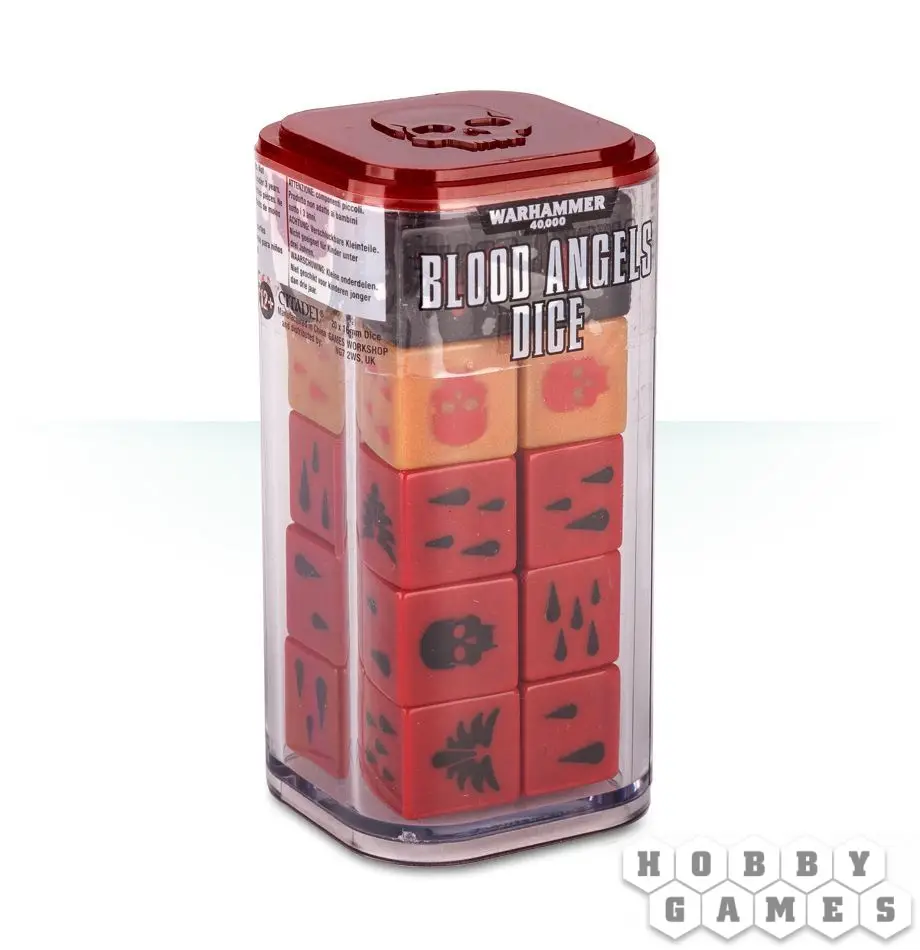 12 красных кубов с черными значками, отображающих основную цветовую схему Кровавыхых Ангелов
