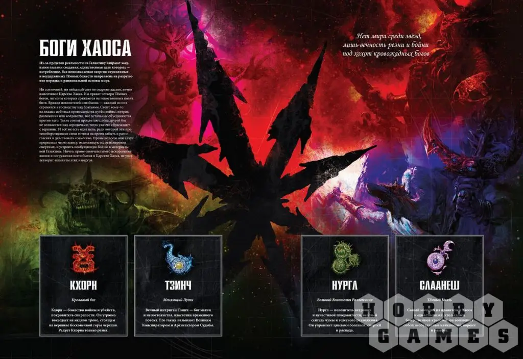 Здесь Вы найдёте описания богов Хаоса: их сущности, мотивов и методов, а также мерзких орд еретиков-астартес: некогда благородных космических десантников, ныне всецело попавших под тлетворное влияние Хаоса и позорящих своё существование, сражаясь за своих тёмных господ.
