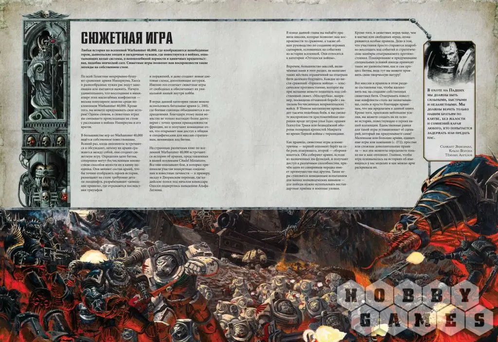 Сюжетные игры: обширная история мира Warhammer 40,000 богата на эпичные сражения. Если Вы и Ваши друзья захотите разыграть некоторые из этих баталий, то в этом Вам помогут специальные правила для сюжетных игр, описывающие скрытую расстановку и случайную длительность боя, а также 6 миссий Горнила войны и 1 миссию Отголосков войны, демонстрирующих дух сюжетной игры