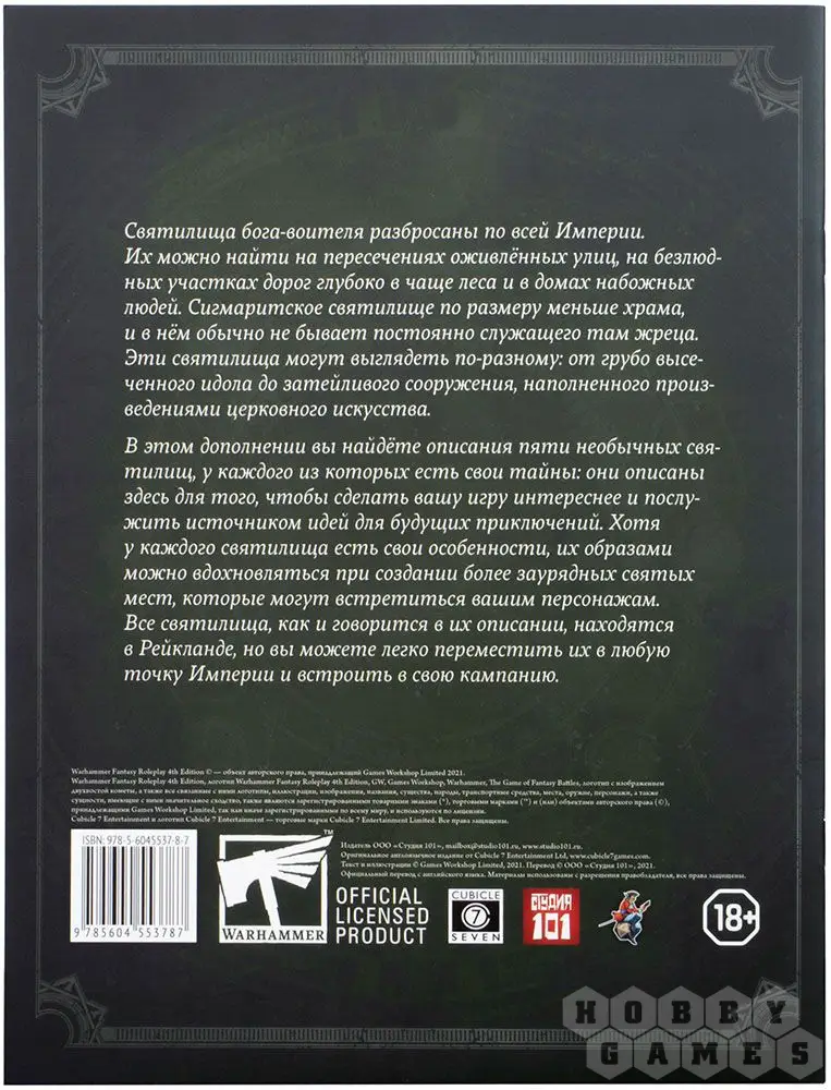В этом дополнении к Warhammer Fantasy Roleplay вы найдёте рассказы о пяти совершенно разных святилищах, разбросанных по Рейкланду, житнице Империи. Впрочем, похожие могут встретиться вашим героям и в любом другом регионе, ведь Сигмара чтут везде. Каждое святилище уникально и обладает собственными тайнами, раскрыть многие из которых ещё никому не удавалось. Станут ли ваши герои одними из счастливчиков?