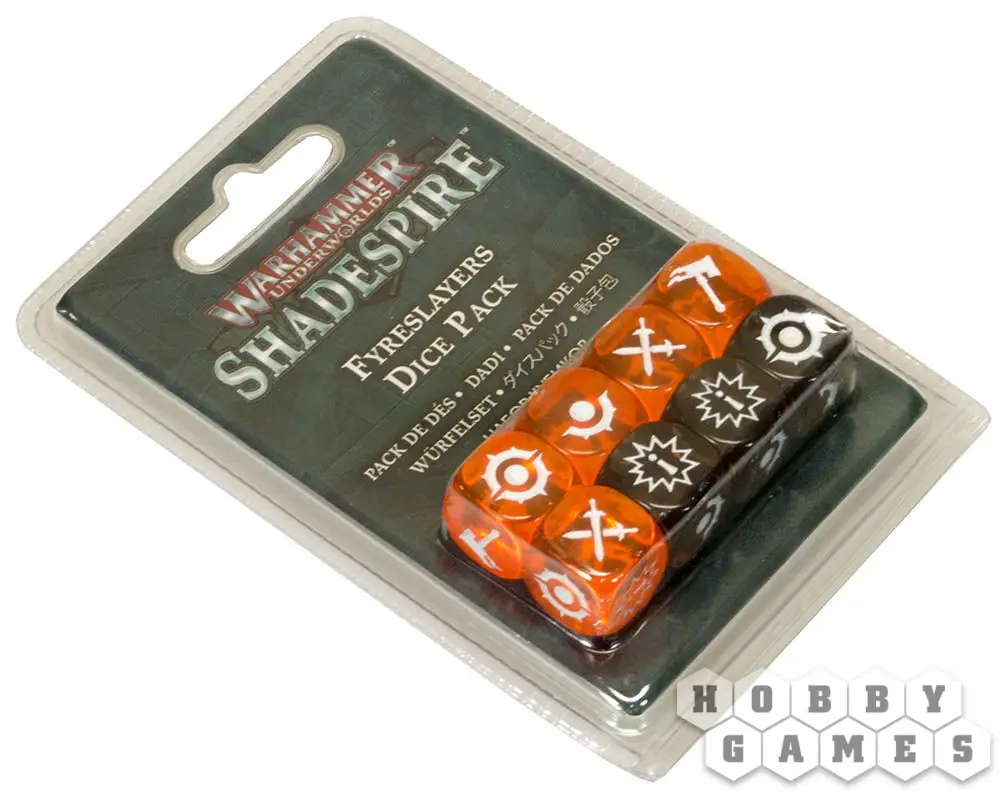Это набор кубиков, выполненных в стиле Огнеубийц. Он подойдёт для игры Warhammer Underworlds: Shadespire. В наборе 8 шестигранных кубика: 3 серых для Защиты и 5 оранжевых для Атаки, с соответствующими символами на гранях. Берите запасной набор, потому что кубиков много не бывает!