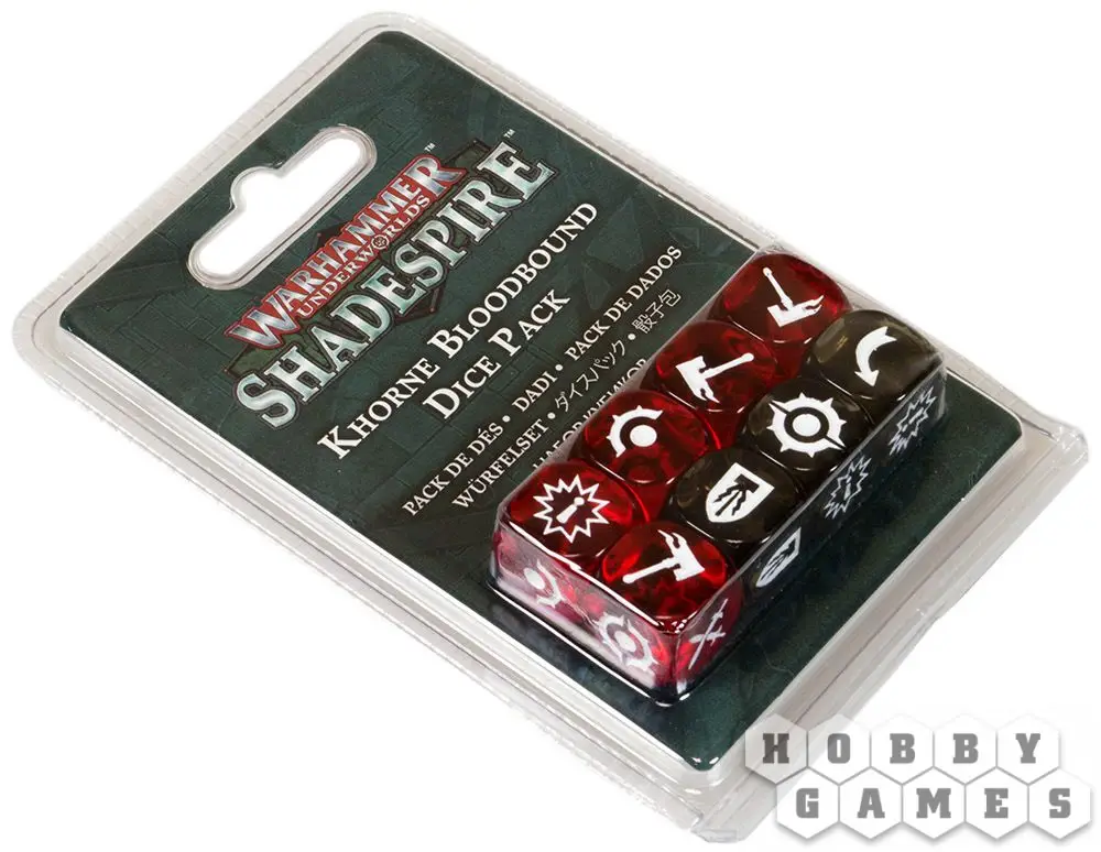 Это набор кубиков, выполненных в стиле Khorne Bloodbound. Он подойдёт для банды Кровавых Разбойников Гаррека из игры Warhammer Underworlds Shadespire. В наборе 8 шестигранных кубиков: 3 серых для Защиты и 5 красных для Атаки, с соответствующими символами на гранях. Берите запасной набор, потому что кубиков много не бывает!