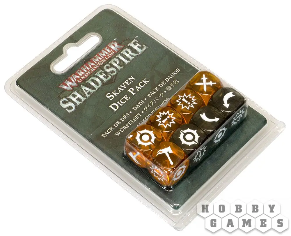 Это набор кубиков, выполненных в стиле Скавенов. Он подойдёт для игры Warhammer Underworlds: Shadespire. В наборе 8 шестигранных кубика: 3 серых для Защиты и 5 оранжевых для Атаки, с соответствующими символами на гранях. Берите запасной набор, потому что кубиков много не бывает!
