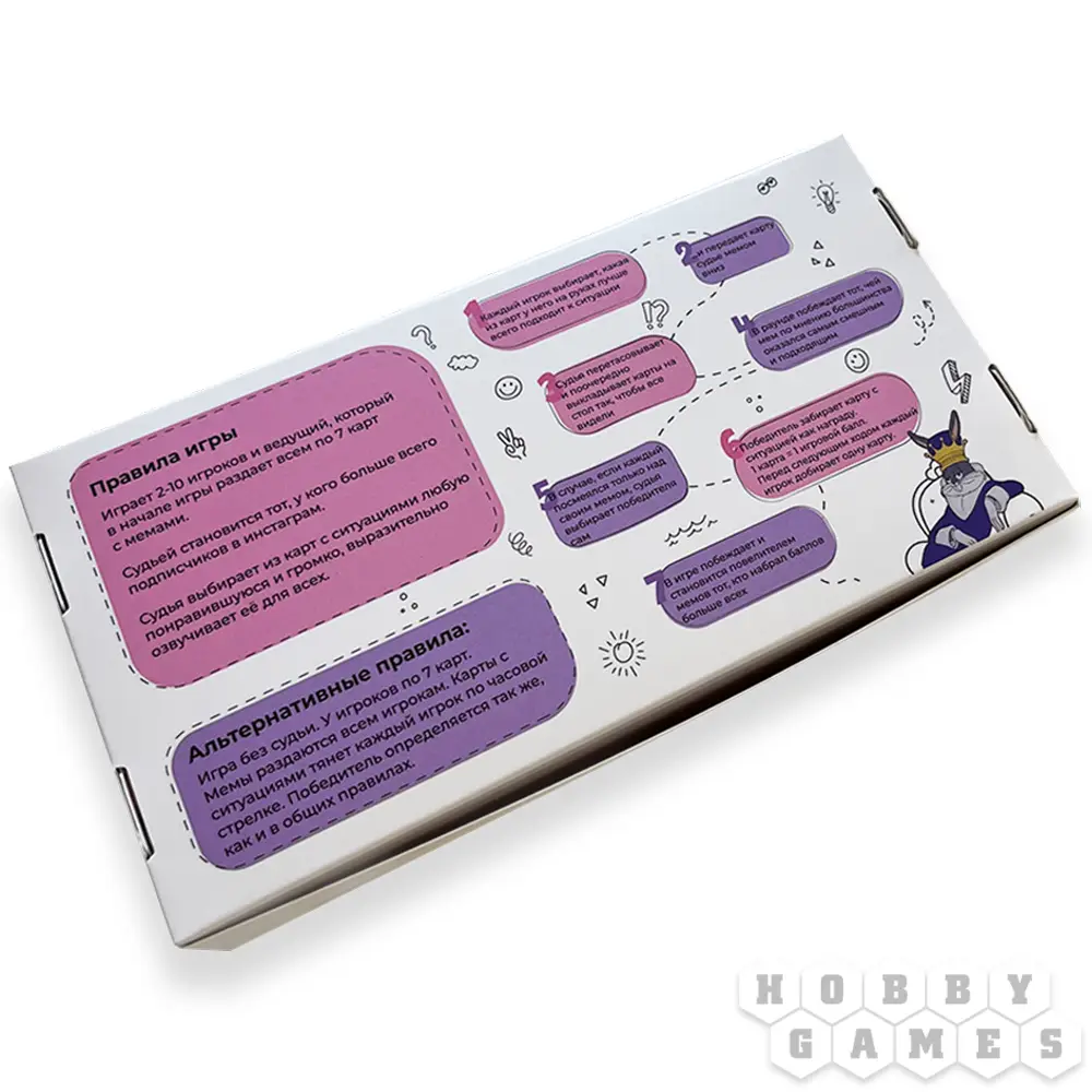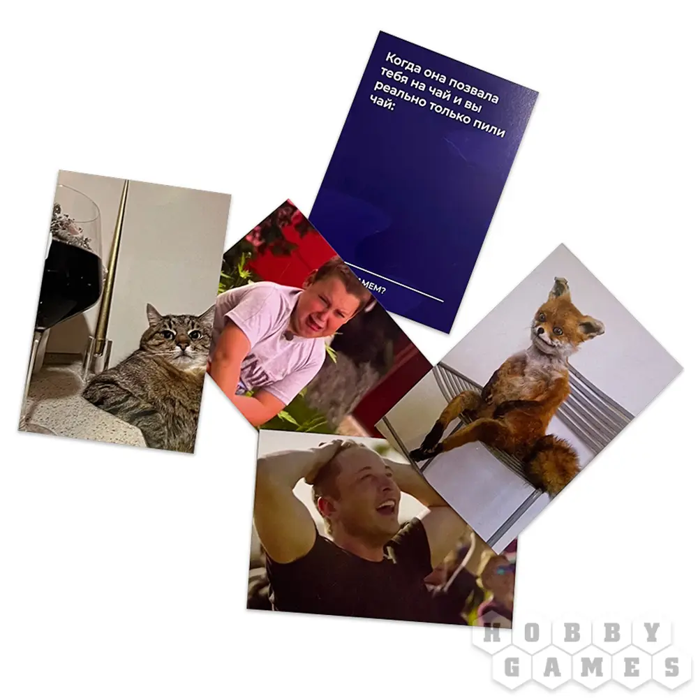 Популярная игра, уже ставшая трендом, покорила сердца любителей карточных игр своей простотой, динамичностью и узнаваемостью. Правила максимально лёгкие: отвечай карточкой с картинкой-мемом на вопрос, создавай смешные комбинации, соревнуйся с друзьями в остроумии! В коробке вы найдёте 100 карточек со смешными жизненными ситуациями и 200 карточек с узнаваемыми крутыми мемами. Любитель настолок будет рад получить эту игру в коллекцию!