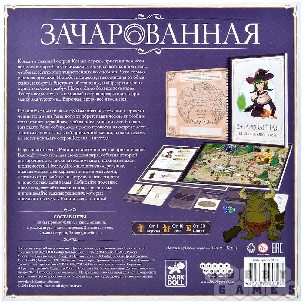 Успешность ваших действий будут определять броски кубиков, но многое зависит и от вашей подготовки. Остров полон магии: вы сможете варить зелья, изучать заклинания и находить могущественные артефакты, которые изменят ход игры. Зельеварение потребует особых ингредиентов, а использование чар – энергии, но они могут открыть перед вами новые пути. Знайте: вам предстоит отправиться в опасное, но увлекательное путешествие, но оно стоит того, ведь вы сможете раскрыть тайны ведьм, освоить магические искусства и понять, какую роль вам уготовано сыграть в судьбе этого зачарованного места.