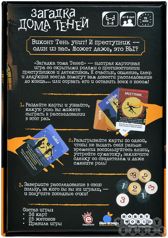 Для победы вам понадобятся острый ум, мастерство блефа и искусство убеждения. Только с их помощью вы сможете разгадать тайну и довести дело до конца… или умело запутать остальных, сорвав расследование и оставив всех в полном замешательстве. Вы готовы к интеллектуальному поединку?
