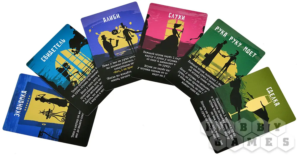 Разыграв "детектива" можно указать на любого игрока и спросить, а не преступник ли он часом. Игрок обязан ответить честно, и если детектив раскрыл его, он получает 2 очка, а все остальные игроки (кроме сообщников) по 1 очку. Но есть карта "алиби", которая позволяет преступнику говорить ложь... И это не все карты и эффекты, которые ждут вас в игре.