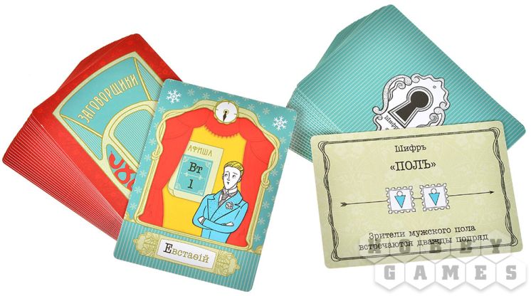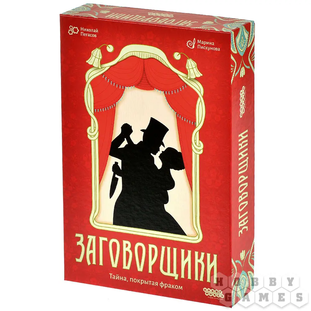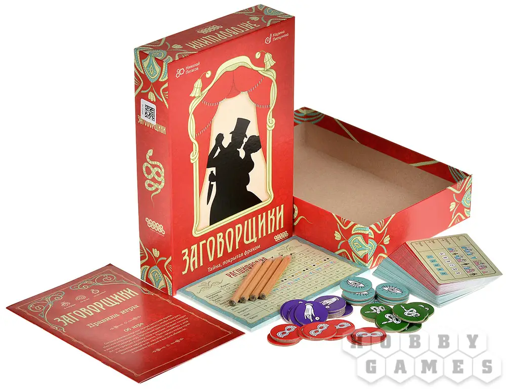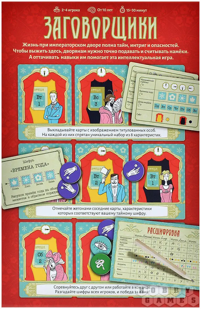 "Заговорщики" – компактная настольная игра на логику и дедукцию, в которой вам предстоит раскрывать тайные шифры других игроков. В центре внимания – карты персонажей, изображающие титулованных особ. Каждая карта содержит уникальный набор из восьми характеристик, скрытых от чужих глаз. Ваша цель – с помощью жетонов сигналов отмечать тех соседей по столу, чьи тайные характеристики соответствуют вашему личному шифру, который вытягивается в начале партии.