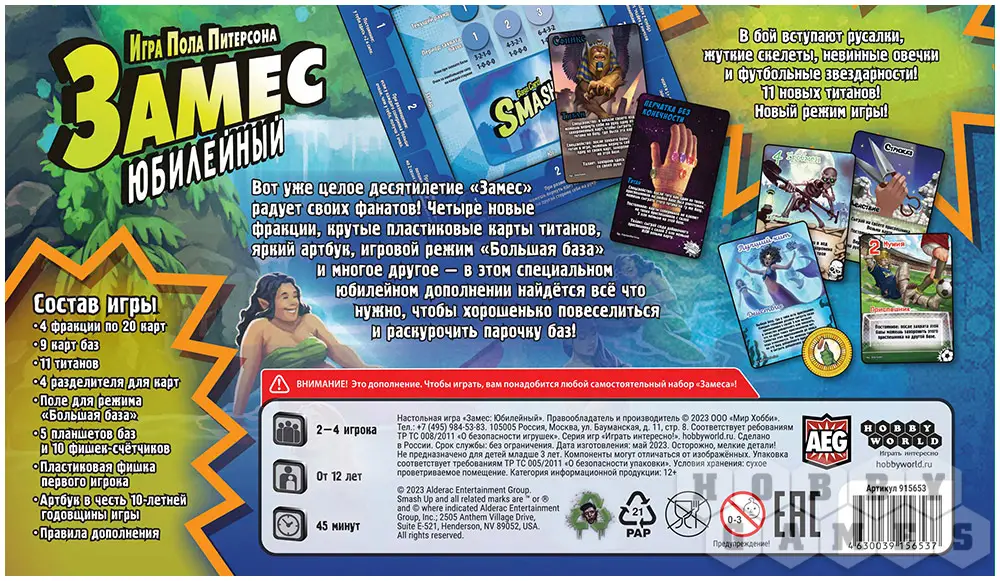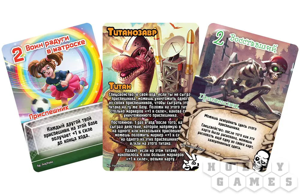 Внутри этой коробки вас ждёт новый игровой режим "Большая база", а также четвёрка абсолютно новых фракций: футбольные звездарности, русалки, овечки и скелеты! Но это было бы слишком простым наполнением для юбилейного выпуска, поэтому в составе вы также найдёте красочный артбук и пластиковые карты титанов! Кстати, фишка первого игрока тоже теперь пластиковая. А ещё вы найдёте новых персонажей, впервые появляющихся в этой серии, и кучу разных интересностей и приятностей. Это просто праздник какой-то!
