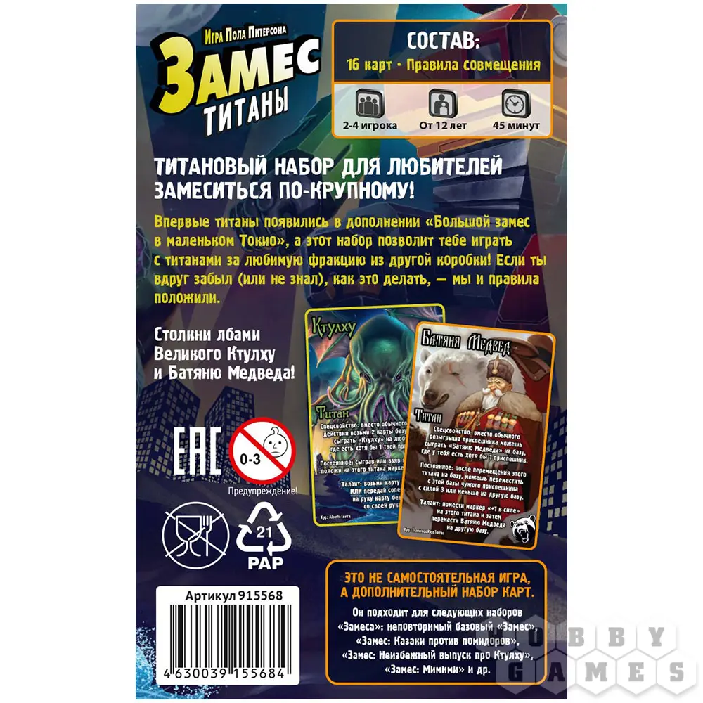 В "Замес. Неизбежный выпуск про Ктулху" можно играть как в самостоятельную игру, если вы решитесь начать замес вдвоём, но для большего количества игроков вам потребуется базовая версия игры "Замес". Данный набор содержит карты титанов для 16 колод из разных наборов "Замеса" – от неповторимой классики до такого свежака, как "Мишки, бабки, рок-н-ролл".