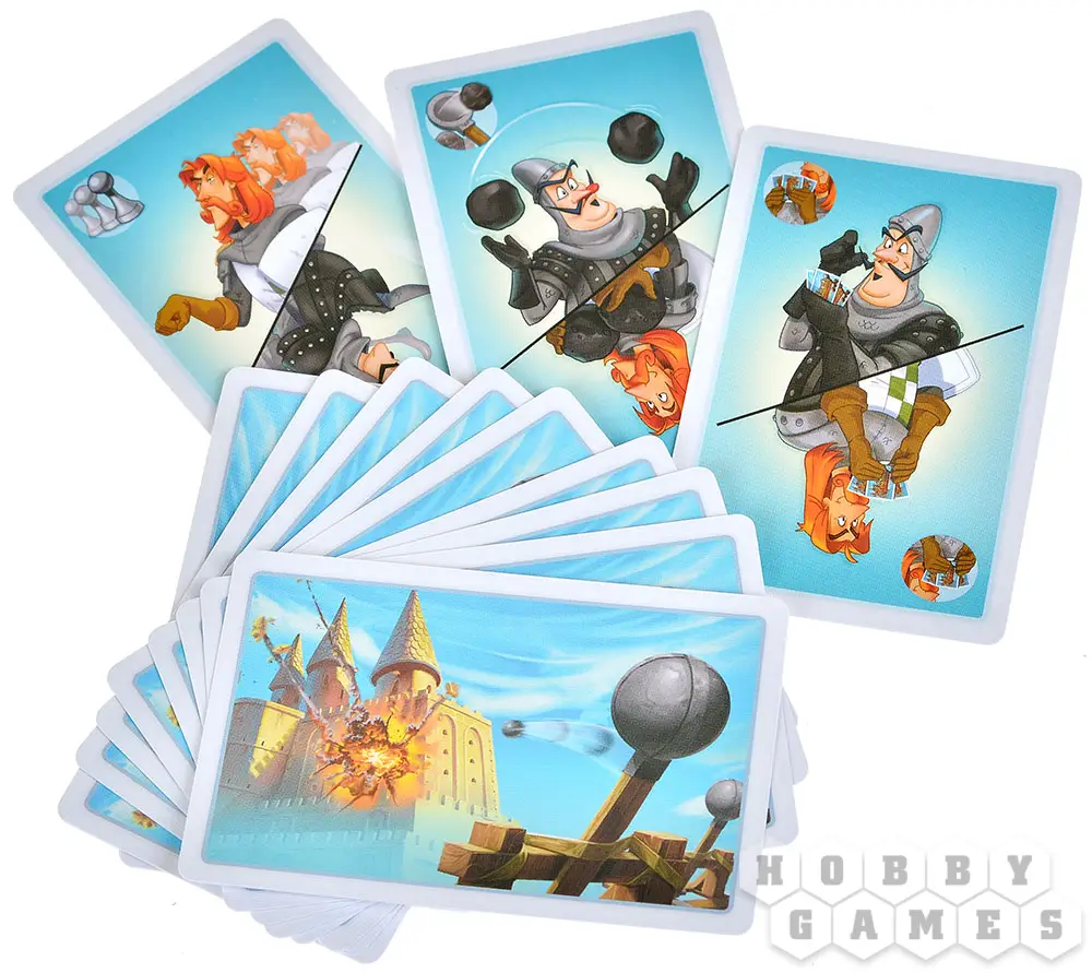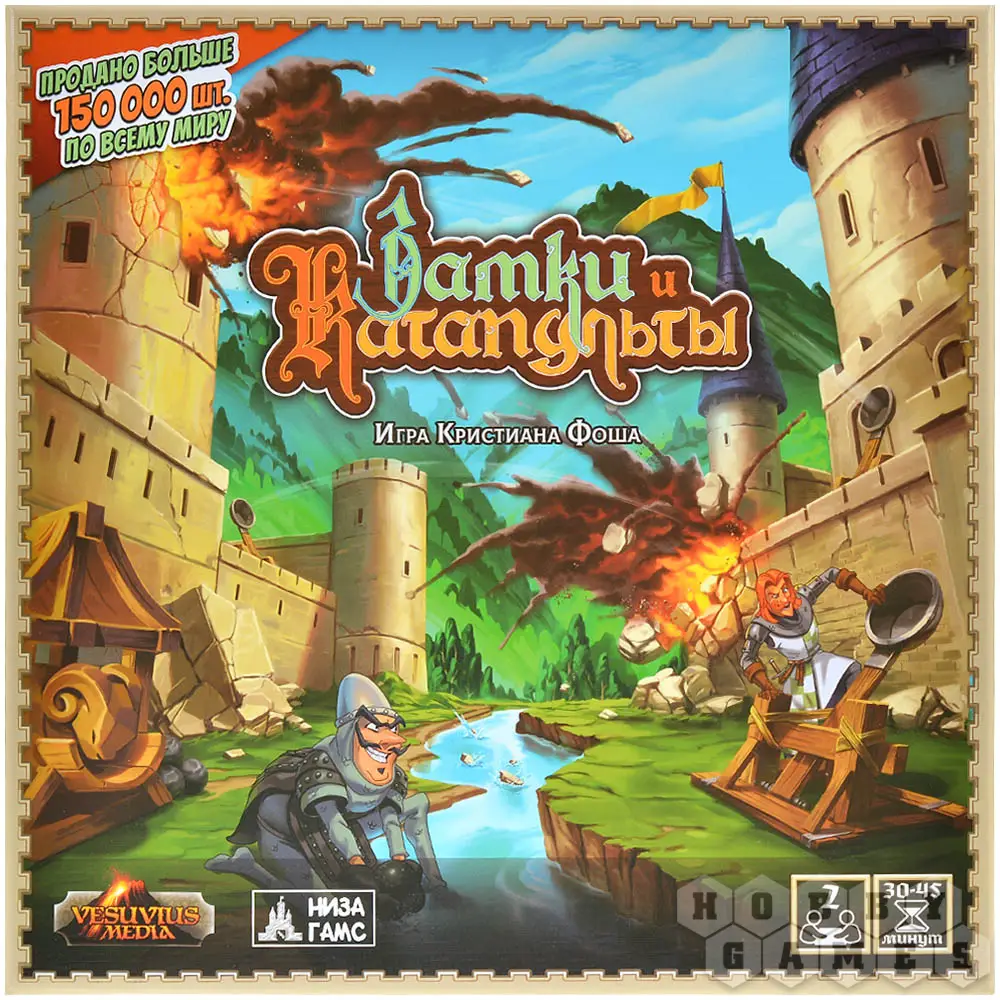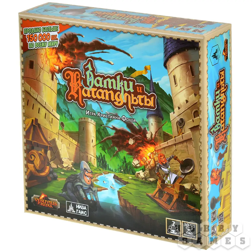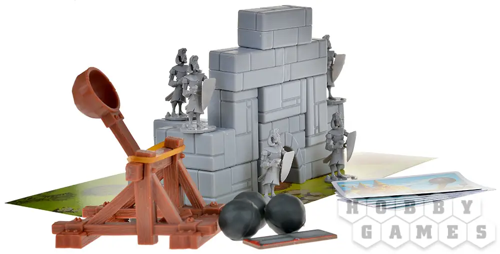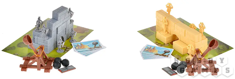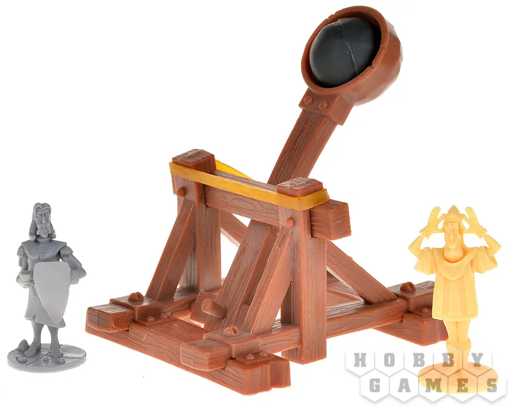 "Замки и Катапульты" – это семейная интерактивная игра, в которой двум игрокам предстоит возвести укрепления из строительных блоков, расставить по ним фигурки своих солдат и начать катапультную артподготовку (контемпорари арт тут ни при чём!) перед наступлением. Они будут расстреливать замки друг друга и разыгрывать карты действий, ремонтируя укрепления, производя залпы, воруя эти карты друг у друга и склоняя солдат противника к предательству. Выиграет тот, кто выведет из строя всю армию противника.