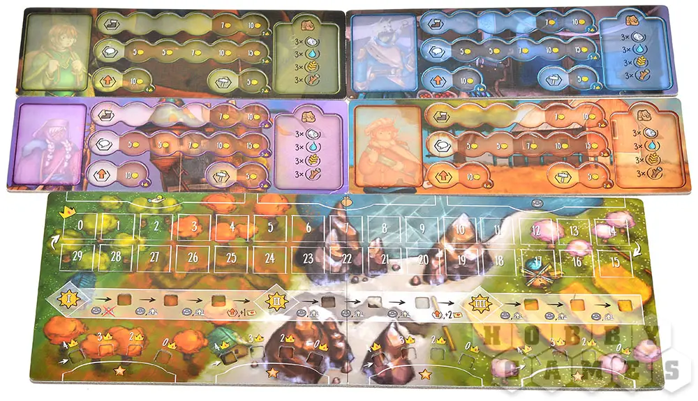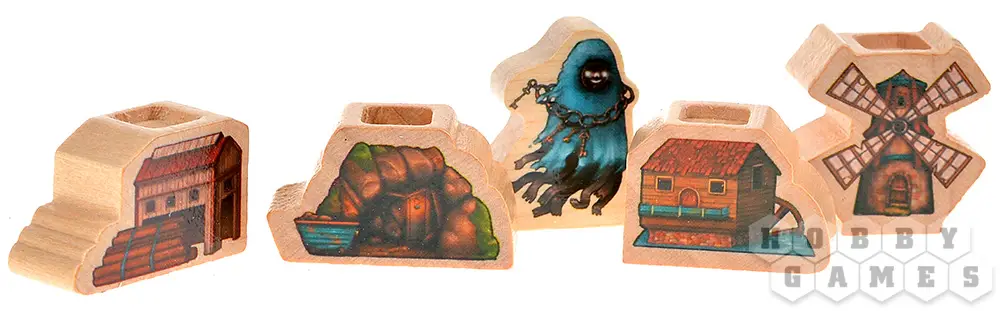 Партия длится 3 сезона, а каждый сезон делится на 3 раунда. Если бы не беды с призраками, этой игры не случилось бы, а потому каждый раунд начинается с распространения: последний игрок бросает кубик местности и выставляет из запаса 4 фишки призраков на клетки того ландшафта, который выпал на кубике. В пустые земли идти не стоит, а потому следом идёт фаза производства: все здания на игровом поле производят ресурсы. И вот теперь начинаются путешествия сенсориков! В свой ход игроки могут выполнять любое количество основных действий (пока им хватает жетонов действий):