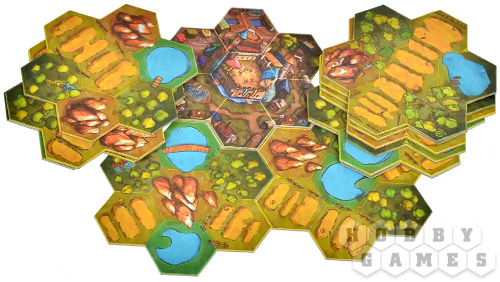 В центре стола находится игровое поле – город Калена и 6 регионов, размещённых вокруг поселения случайным образом. Рядом лежат ресурсы, игровой планшет с картами навыков и рынка, а перед каждым игроком личный планшет, фишка его сенсорика, маркеры и карты заданий.