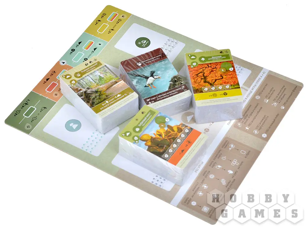 Цель игры: набрать как можно больше победных очков, создавая гармоничную и процветающую экосистему! Игра завершается, когда один из игроков завершает свой остров, разместив 16 карт на своём поле. Дальше все игроки подсчитывают очки за размещенные на их полях карты. Каждое ваше решение будет влиять на конечный результат, и только тот, кто сможет достичь идеального баланса, станет победителем. Стремитесь к гармонии и балансу, и пусть ваш остров станет самым цветущим и живописным среди всех!