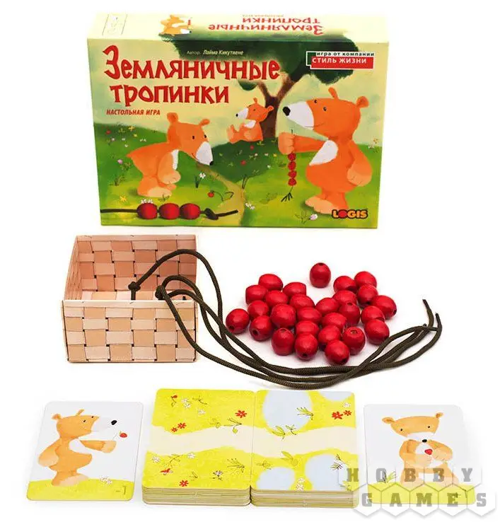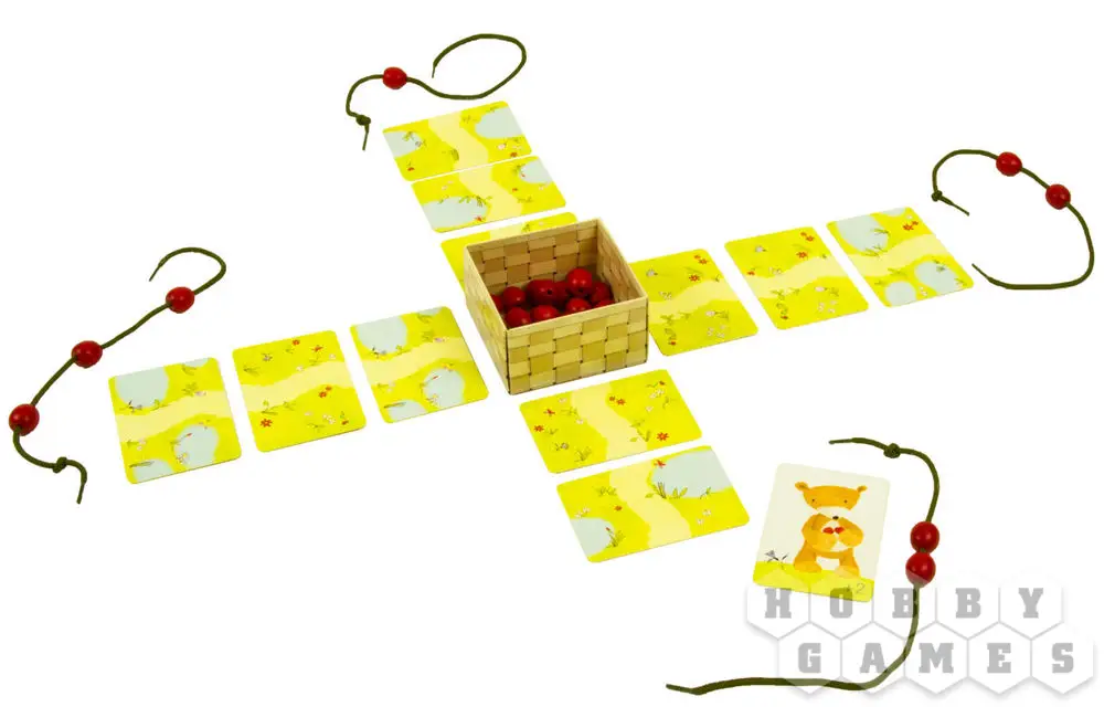 Одну ягодку беру, на другую смотрю... К каждому игроку тянется земляничная тропинка из карт. Переворачивая в свой ход крайнюю карту, он берёт из лукошка столько ягодок, сколько указано на карте, и нанизывает их на шнурочек. Когда медвежата добегут со своей добычей до пруда (ближайшие к лукошку карты), настанет время делиться.