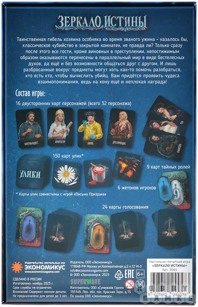 Поведайте всем игрокам душераздирающую историю, которая связывает вас с хозяином дома. Возьмите по карте тайных ролей, которые помогут объяснить, кем вы являетесь. Важно заметить, что все игроки невиновны, а убийц надо вычислить методом исключения. “Зеркало Истины” – соревновательная игра в отличие от других игр этой серии, где две команды борются друг против друга... Здесь каждый игрок должен объяснить личность своего персонажа и при этом стать первым, кто разгадает тайны других и разоблачит убийцу.