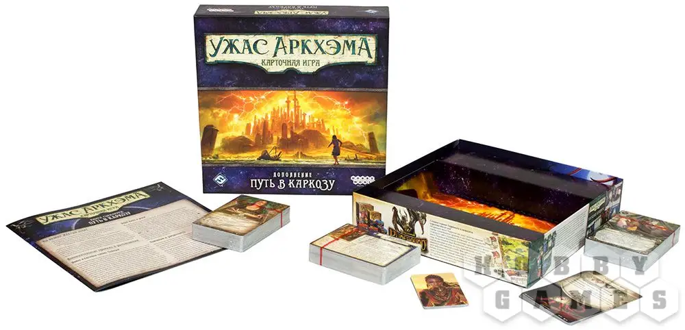 "Путь в Каркозу" – это второе делюксовое дополнение к карточной версии "Ужаса Аркхэма", предлагающее вам два стартовых сценария: "Дайте занавес" и "Последний король", новые карты, а также интересные механики. Сценарии можно проходить как отдельно, так и в рамках большой кампании из восьми сценариев, которые приобретаются отдельно. В игре появляется новое ключевое слово – "Тайный". Такие карты очень интересны в своей работе и добавляют атмосферности игре. Эти карты добавляются в руку игроку тайно, то есть текст этих карт знает только сам игрок. От них нельзя избавиться обычными способами, и карта при этом идёт в счёт размера руки. Однако, в отличие от слабостей, эти карты не станут частью вашей колоды. Пока карта находится в руке, действуют все её постоянные свойства, а активные может применить сам игрок.
