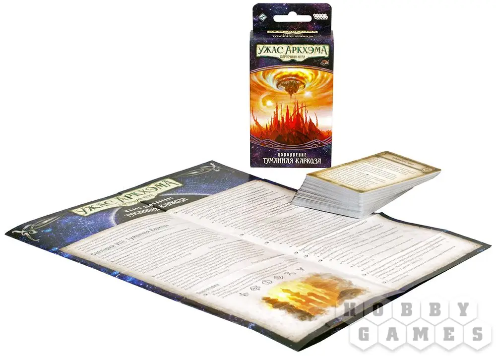 "Туманная Каркоза" – шестое, последнее малое дополнение и восьмой сценарий в цикле "Путь в Каркозу", который полностью завершает интереснейшую кампанию. История, в течение которой вы побывали в разных точках Земли, в конце концов приводит вас в безумное царство Хастура среди звёзд – Каркозу. Тёмные шпили и обсидиановые платформы, противоестественная архитектура запутанных улиц и два солнца высоко в небе – вот что встречает в этом мире. Вам предстоит столкнуться лицом к лицу с Королём в жёлтом.
