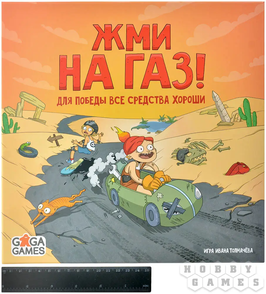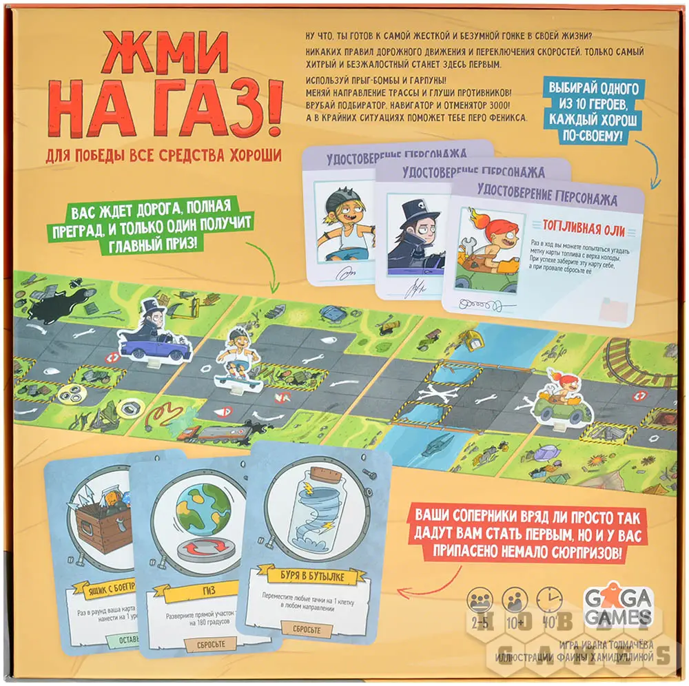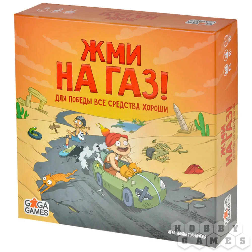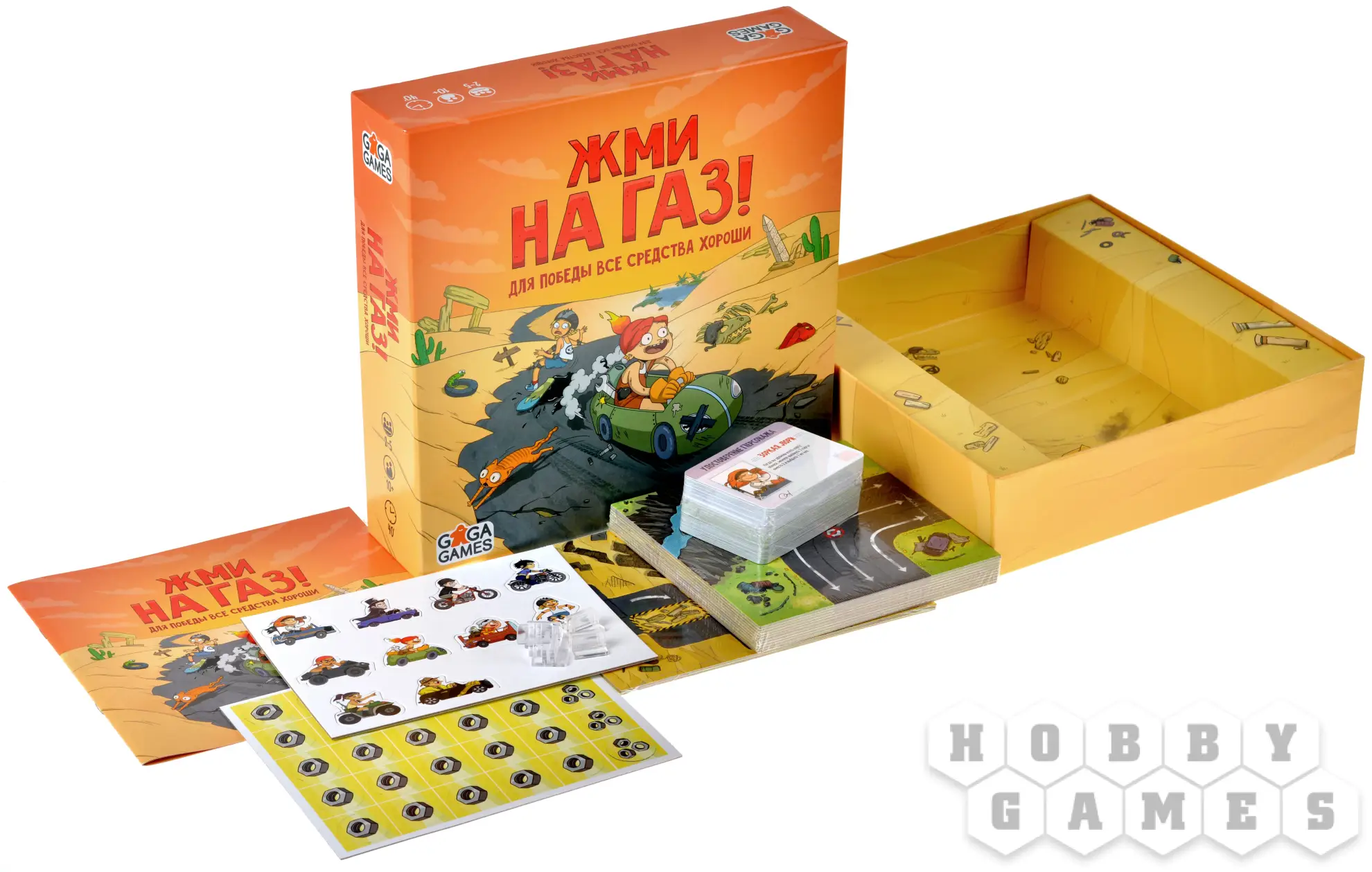"Жми на газ!" – это азартная и динамичная настольная игра-гонка. Выберите своего гонщика и обставьте соперников! Цель игры максимально проста и логична – прийти к финишу первым! И для этого используйте всё, что можете: разыгрывайте карты топлива, чтобы проехать участок как можно дальше, подстраивайте маршрут, чтобы занять наиболее выгодную клетку, а также цепляйте обвесы на свою тачку, чтобы помогать себе и мешать соперникам.