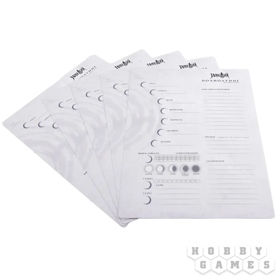 Вырезанные со скруглёнными углами из плотной бумаги премиального качества, эти бланки покрыты износостойкой матовой плёнкой. Поверхность приятна на ощупь и не даёт бликов, а специальное покрытие выдерживает многократное использование. Пишите карандашом, стирайте обычным ластиком – никаких следов, потёртостей или повреждений. Десятки сессий, бесчисленные изменения судьбы персонажа – бланк останется таким же, каким был в первый день.
