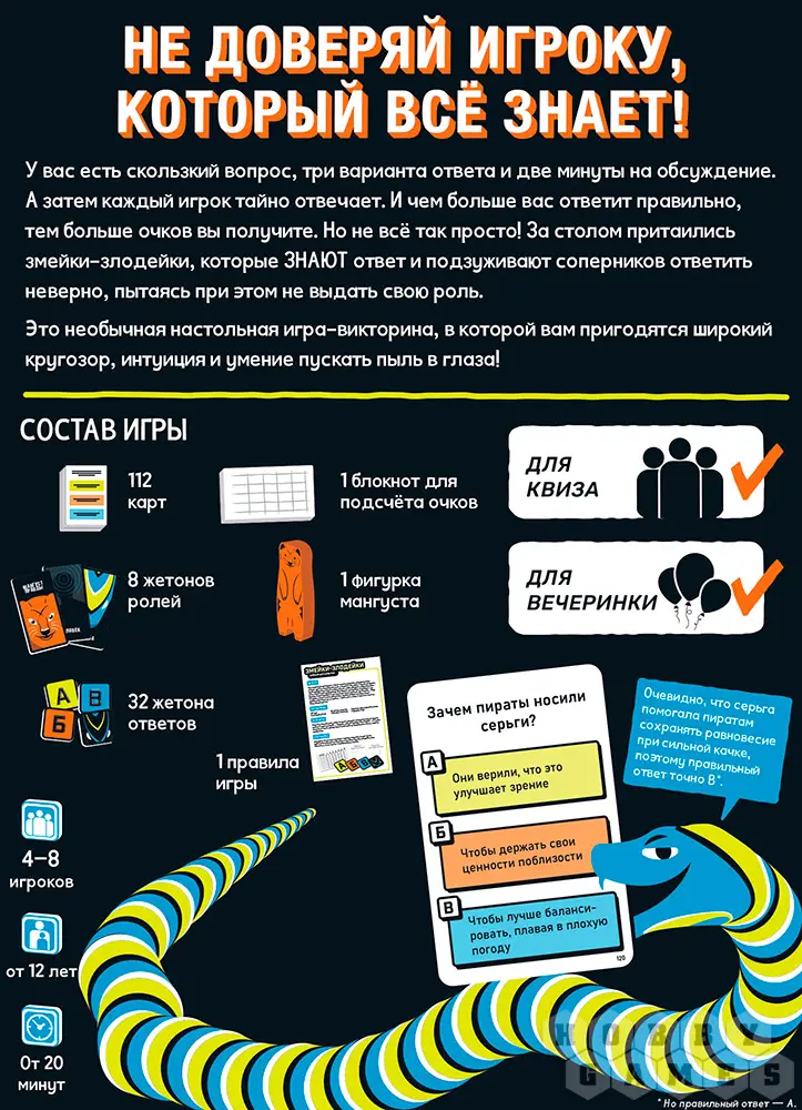 "Змейки-злодейки" – это настольная игра-викторина со скрытыми ролями, которая отлично подходит для дружеской посиделки или даже небольшой вечеринки. Повинуясь воле Жетонов Судьбы, вы разделитесь на две группы: на команду людей и команду змеек. Но есть загвоздка: люди не будут знать, кто из верных товарищей на самом деле змейка, а змейки будут изо всех сил мешать людям победить. Каждый ход вы будете тянуть карты с вопросами, но приготовьтесь к тому, что вопросы эти окажутся по-настоящему с-скользкие – придётся хорошенько подумать! Но только людям, не змейкам... Они будут знать правильный ответ. Наберёте ли вы больше всех баллов в этой непростой викторине?