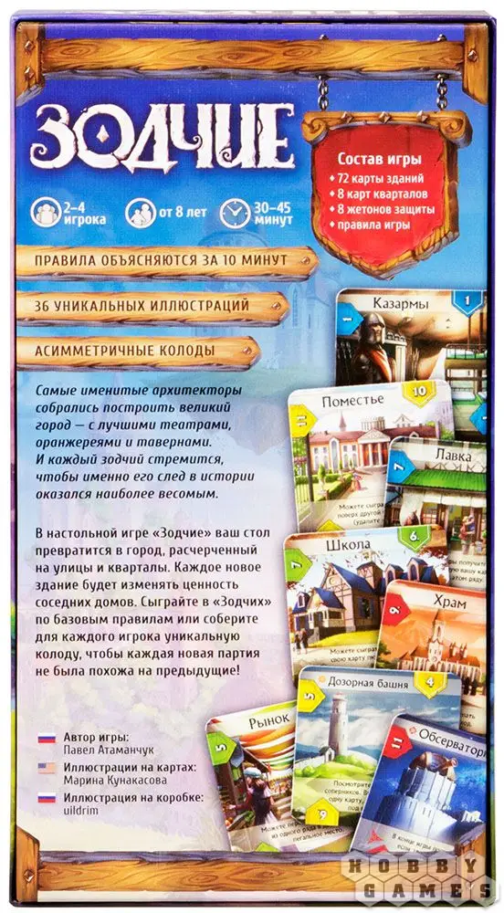 "Зодчие" – это увлекательная карточная игра в фэнтезийном сеттинге, посвящённая строительству города. Игрокам предстоит разыгрывать свои карты строений с руки и располагать их максимально эффективно. У каждого строения есть собственная стоимость, которая зависит от соседних зданий. По ходу игры нужно стараться увеличить стоимость собственных зданий и понизить стоимость конкурентам, для чего можно использовать различные способности с карт зданий.