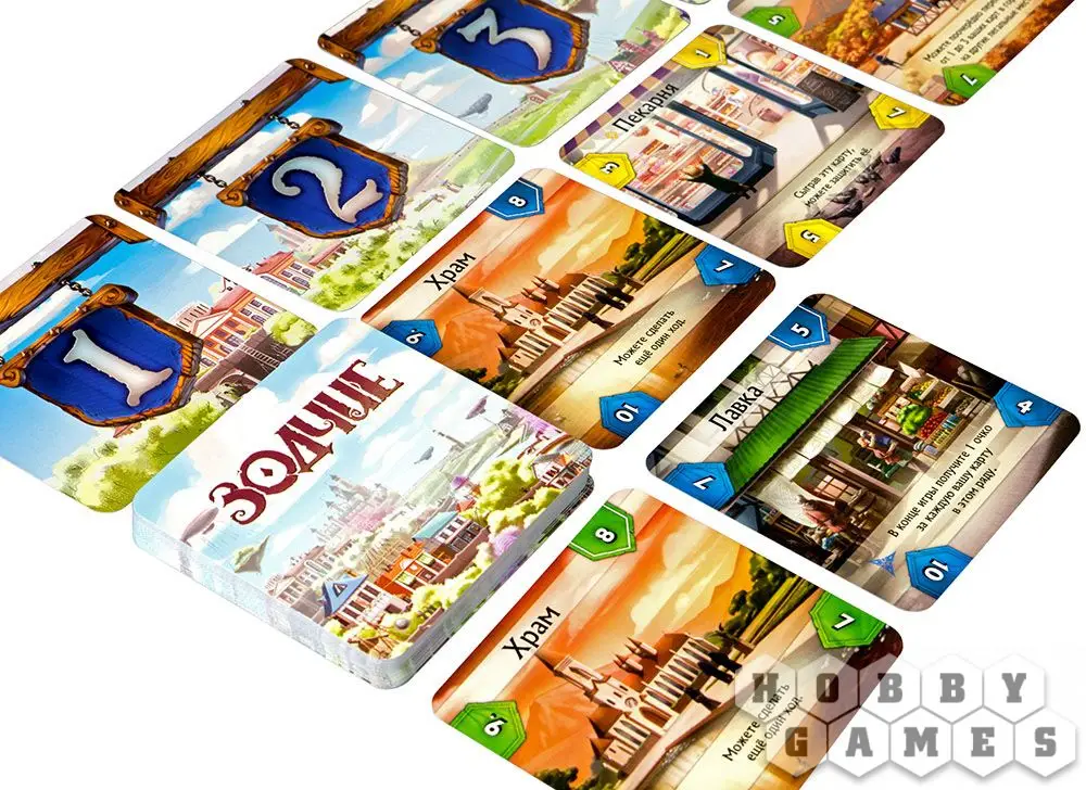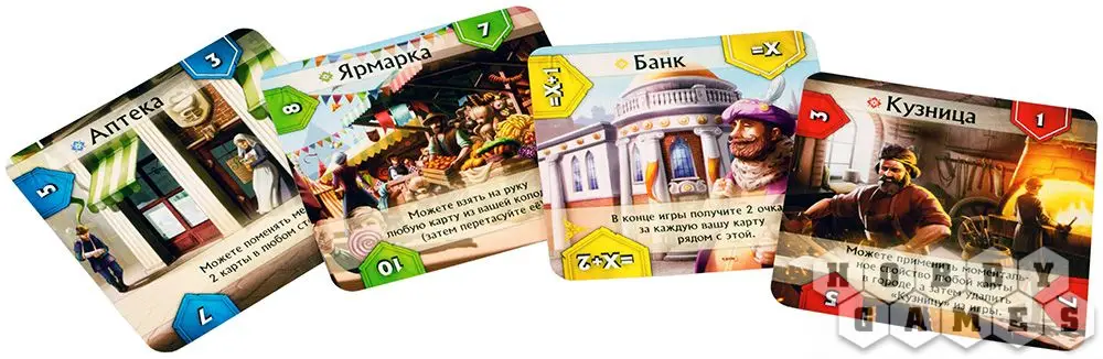 В Вашем распоряжении будет множество построек, которые так необходимы городу: таверны с гостиницами, ратуши, аптеки, дозорные башни и даже академия магии! Причём все карты уникальны и обладают интересным эффектом – некоторые позволят добирать карты, другие менять расположение зданий, третьи меняют стоимость построек и т. д.