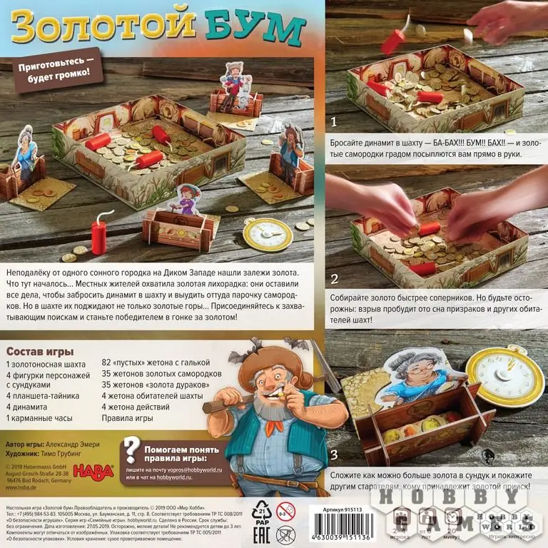 "Золотой бум" – увлекательная приключенческая игра для самых быстрых и зорких. Ведь разбогатеть на золотой лихорадке удастся лишь тому, в чьём сундуке через 12 раундов окажется больше всего золота!