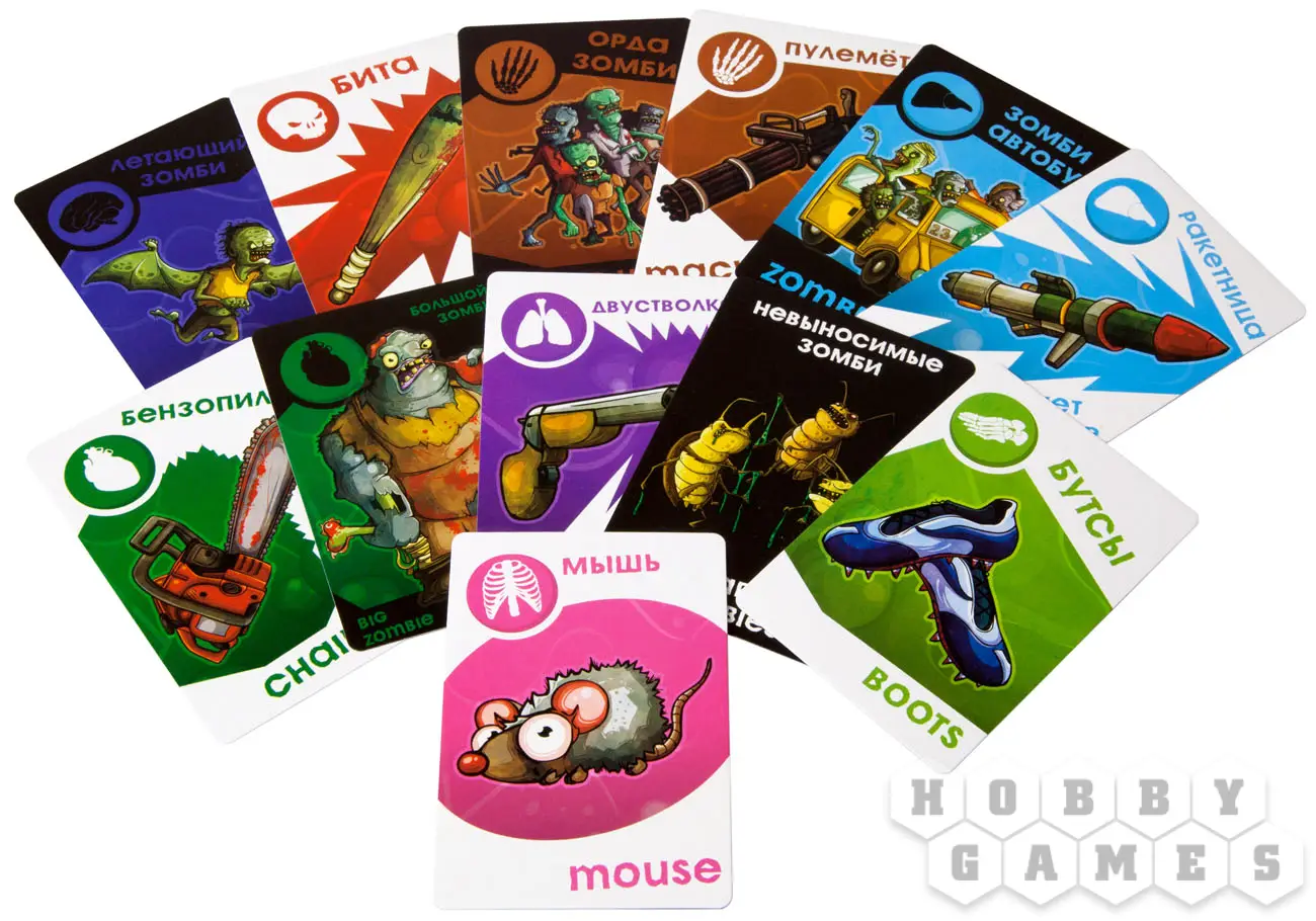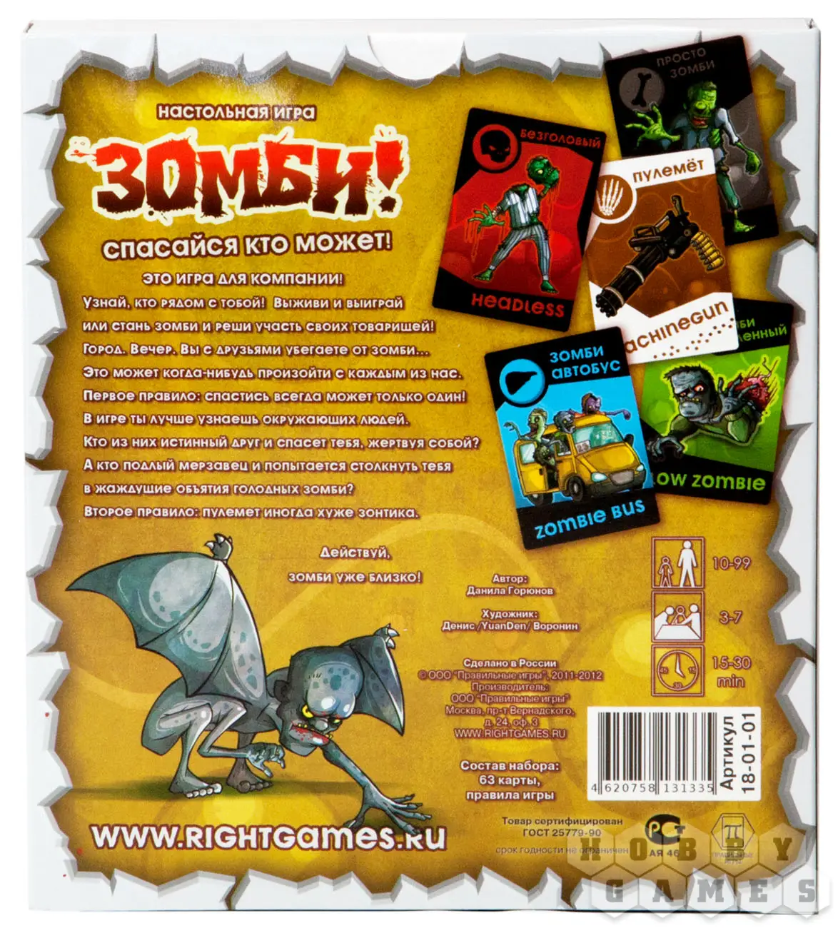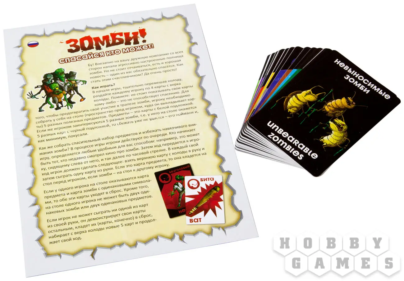 «Зомби! Спасайся кто может!» — это весёлая компанейская настольная игра для 3-7 выживальцев. В начале игры каждый игрок получает по четыре карты и каждый ход добирает одну. Посредством выкладывания карт перед собой или перед оппонентами вы прокладываете себе спасительную дорожку. Ваша задача — собрать как можно быстрее пять разных типов оружия. Но когда перед игроком накапливается пять разных карт зомби, он сам превращается в зомби и старается утащить за собой еще кого-нибудь. Это же так по-дружески...