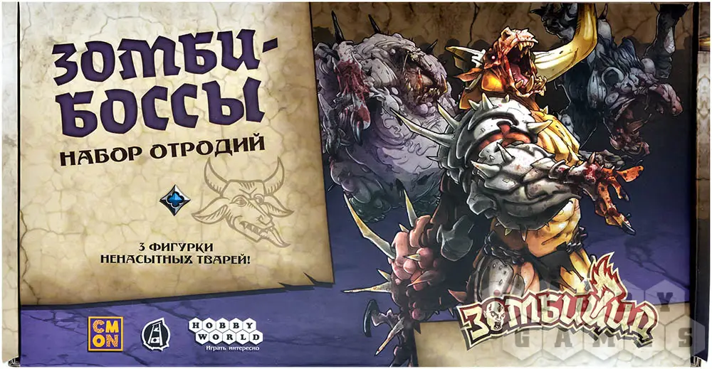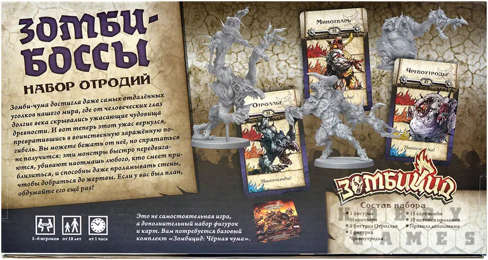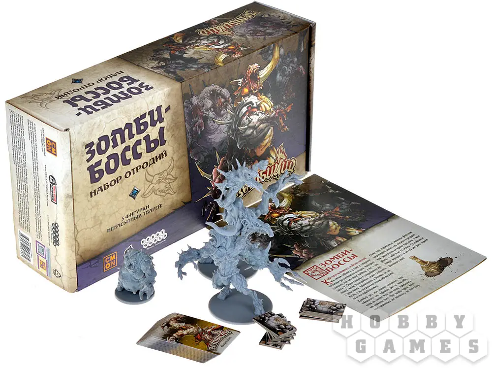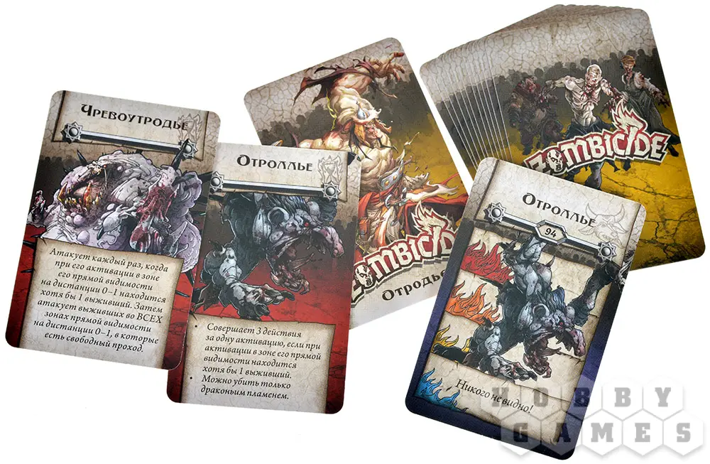 В наборе зомби-боссов вас ждут три весьма оригинальных отродья: Минотварь, Отроллье и Чревоутродье. Зловещие существа добавят немного пикантности в вашу игру, замешайте их в вашу колоду. Основные правила для всех отродий одинаковы, но у каждого из них есть свои тонкости. Например, чтобы покончить с Отролльем вам понадобится специальное смертоносное оружие – Драконье пламя. Не забывайте, что ни броня ни запертые двери не защитят вас от нашествия зомби!