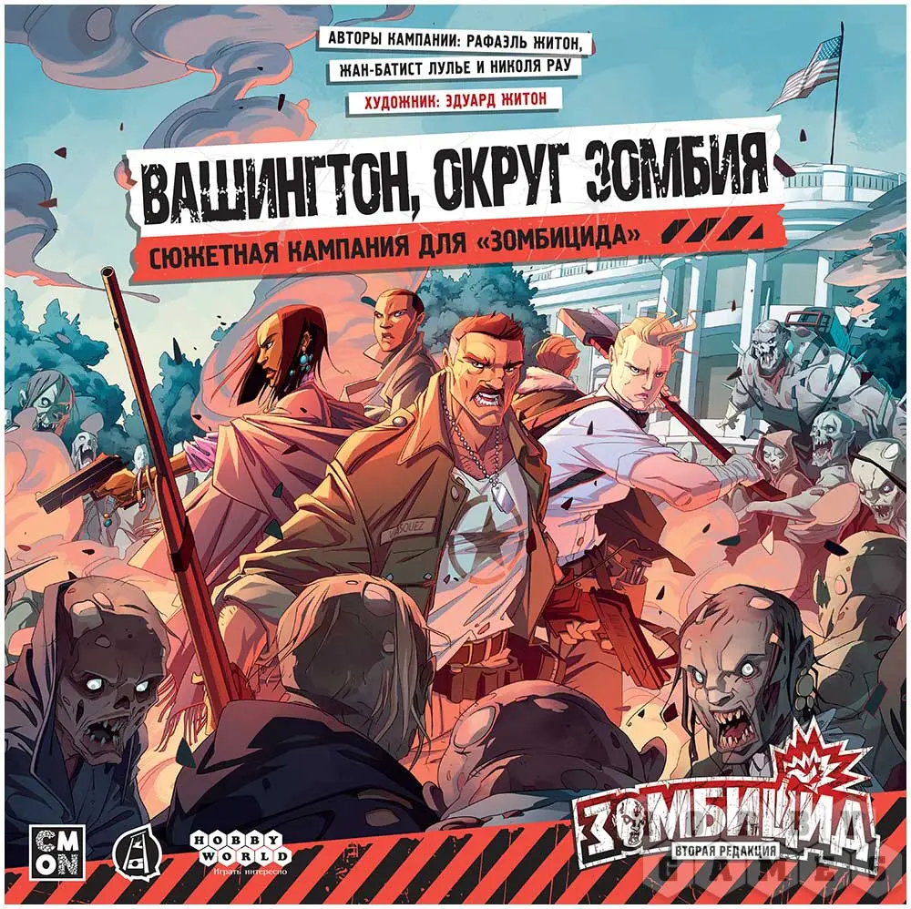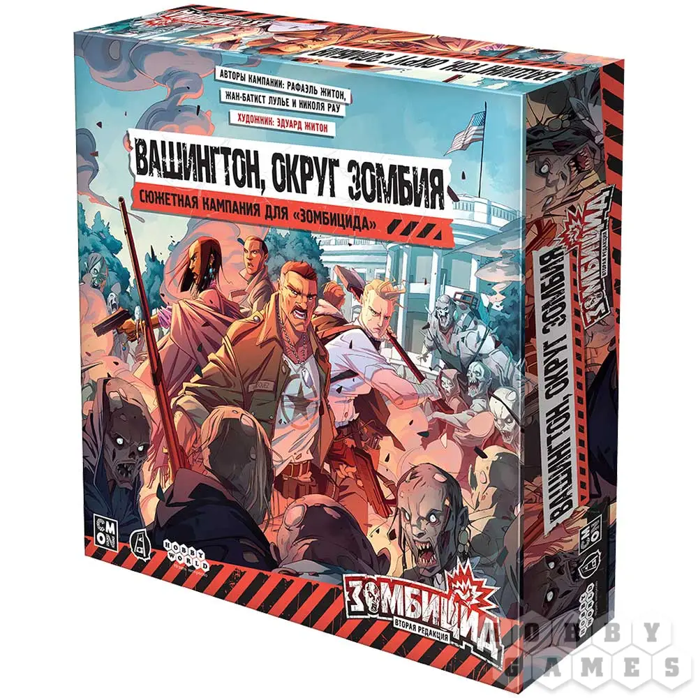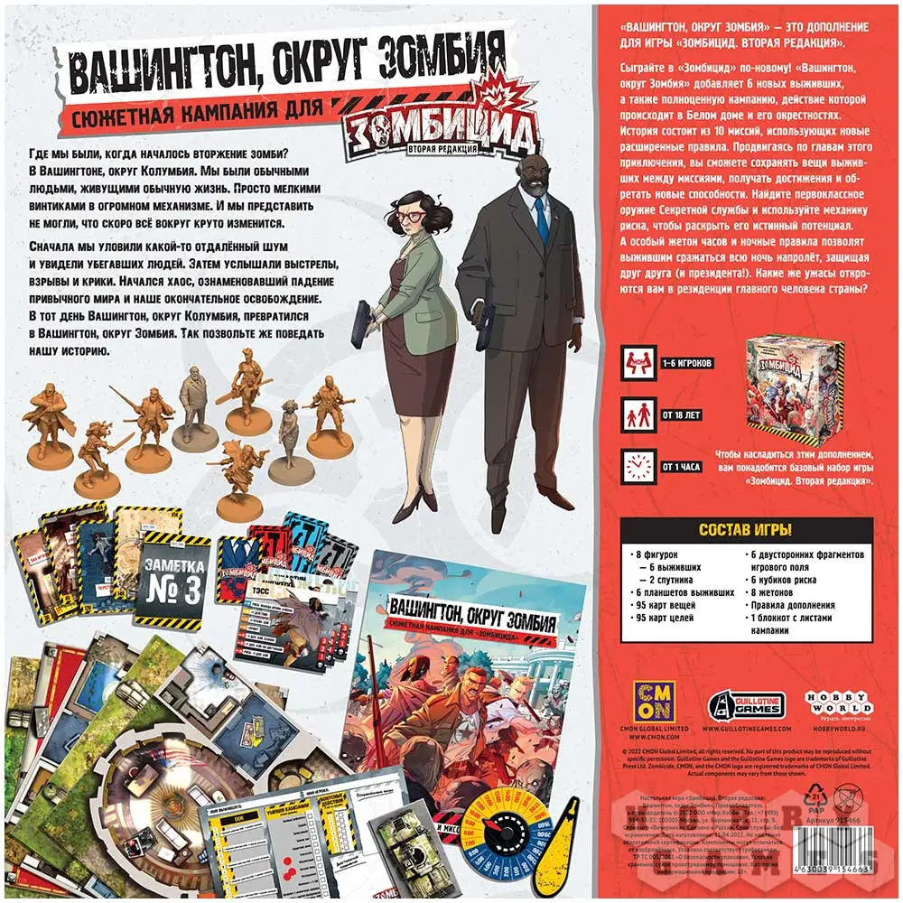 "Вашингтон, округ Зомбия" – это дополнение для настольной игры "Зомбицид. Вторая редакция", которая позволит вам сыграть в эту популярную игру по-новому! Дополнение включает в себя полноценную историю, состоящую из 10 миссий, 6 новых выживших и двух спутников, один из которых – сам президент! Кампания играется по новым, расширенным правилам, которые позволят вам сохранять вещи выживших между миссиями, а также получать достижения и приобретать новые навыки. Если повезёт, сможете разыскать первоклассную экипировку Секретной службы, которая не слабо вас прокачает! Но даже в этом случае расслабляться не стоит: особый жетон часов и ночные правила позволят выжившим рубить зомби в труху всю ночь! Но будет ли это так просто?