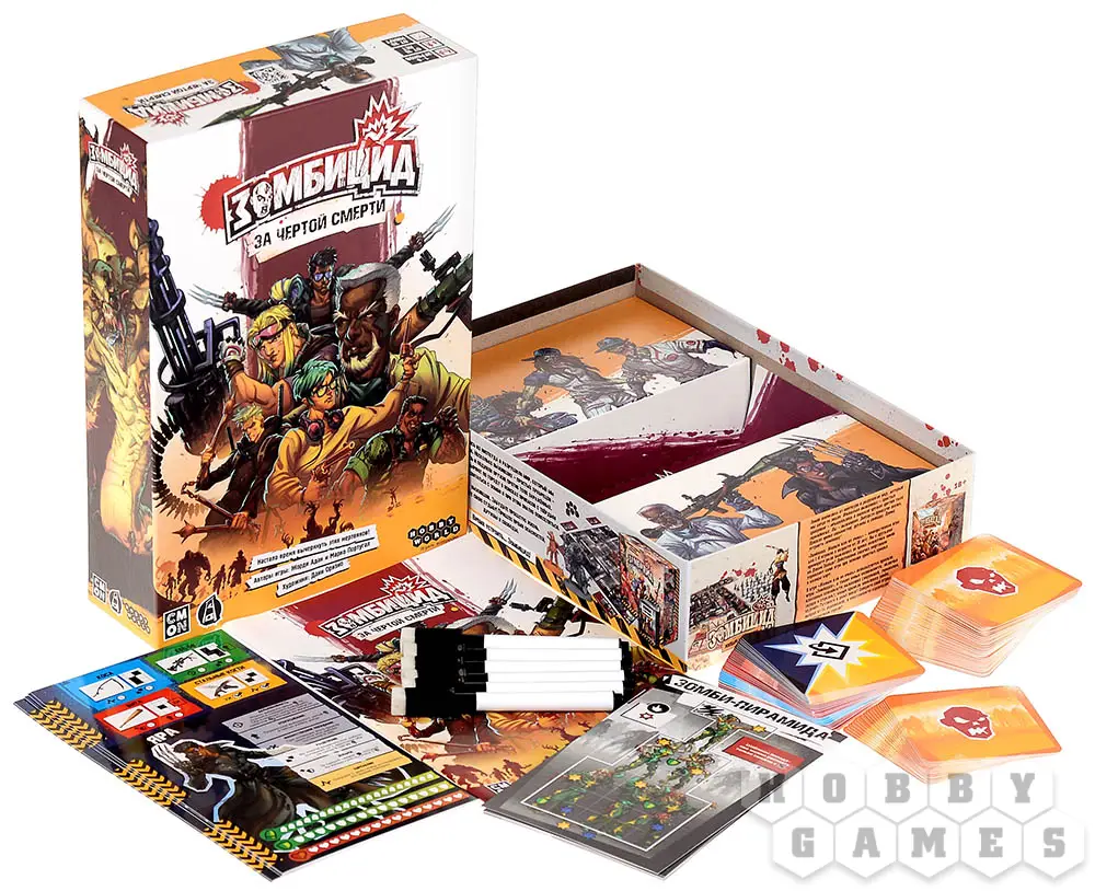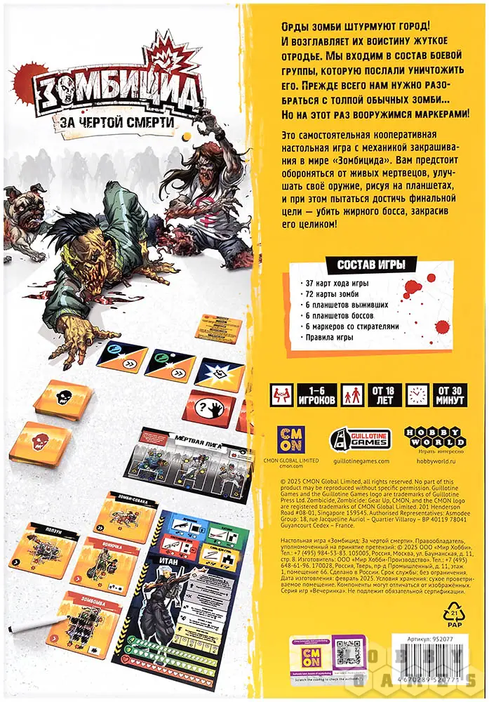 "Зомбицид: За чертой смерти" – это кооперативная настольная игра, в которой игрокам предстоит выживать в мире, охваченном ордами зомби. Вместо традиционных карт и фишек здесь главным инструментом сопротивления становятся маркеры – именно с их помощью вы будете уничтожать нежить, заштриховывая ячейки здоровья на картах врагов. Игра состоит из двух раундов: в первом вы сражаетесь с волнами обычных зомби и улучшаете своё снаряжение, а во втором вам предстоит схватка с гигантским боссом, который угрожает вашему отряду. Продуманные тактические решения и грамотные действия помогут вам дожить до конца и вырваться из этого кошмара!
