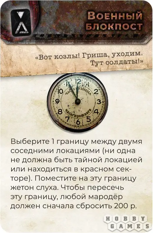 Фаза слухов. В конце раунда вытягивается одна карточка слухов. Они описывают происшествия, которые влияют на всю обстановку в Зоне, подталкивая игроков скорее приблизиться к финишу и победе.