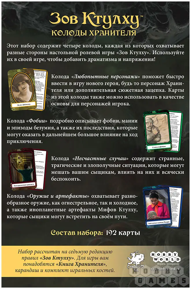 Колода "Фобий" во всех подробностях опишет приступы безумия, мании и страхи, а также их воздействие на героев и дальнейшие последствия