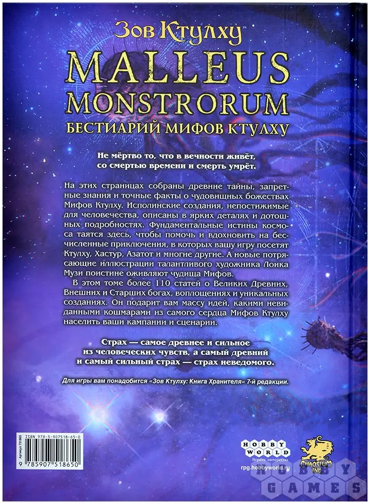 В книге собрано более 110 статей о Великих Древних, Внешних и Старших богах, а также множестве других уникальных созданий. Она откроет безбрежные просторы для полёта фантазии и сопроводит ваши кампании жуткими образами. Приготовьтесь встретиться лицом к лицу с невероятными кошмарами из самых тёмных уголков вселенной.
