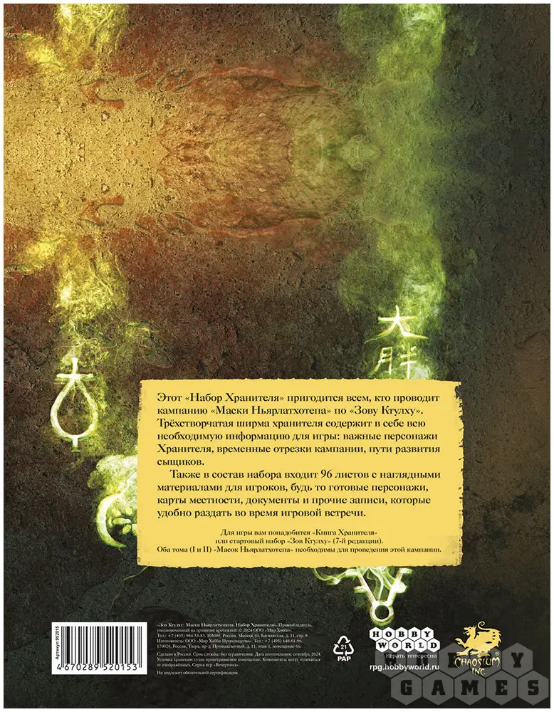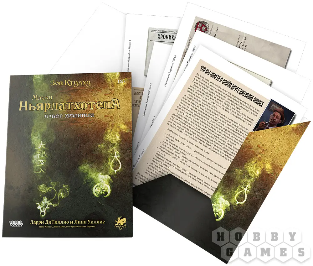 Сыщикам, которые нашли в себе силы выступить против Тёмного бога, понадобится достойная экипировка, чтобы быть максимально готовыми к ожесточённому столкновению с его приспешниками и полчищами мерзких тварей. Этот набор станет отличным подспорьем для всех, кто решит провести кампанию "Маски Ньярлатхотепа" по настольной ролевой игре "Зов Ктулху". В нём содержится ширма хранителя, на которой указана вся самая необходимая информация для игры (имеющие вес персонажи, пути развития и т.д.), а также карта местности и раздаточные материалы.