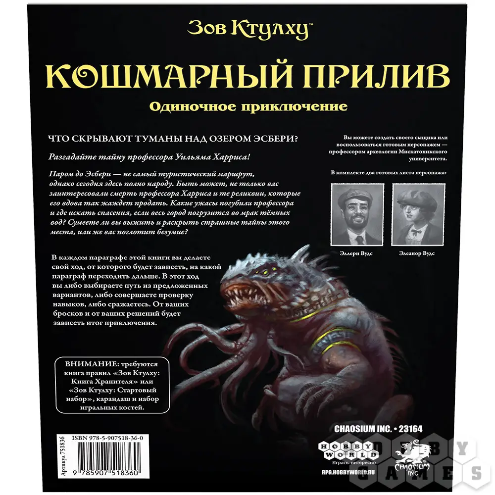 "Кошмарный прилив" – это одиночное приключение, использующее механики игры "Зов Ктулху". Вам предстоит раскрыть тайны тихого городка на берегу озера – и то, как именно будет проходить история, зависит только от ваших решений. В ваших руках как судьба вашего персонажа, так и других людей – исследуйте все уголки этого мира и попробуйте разобраться во всех хитросплетениях истории!