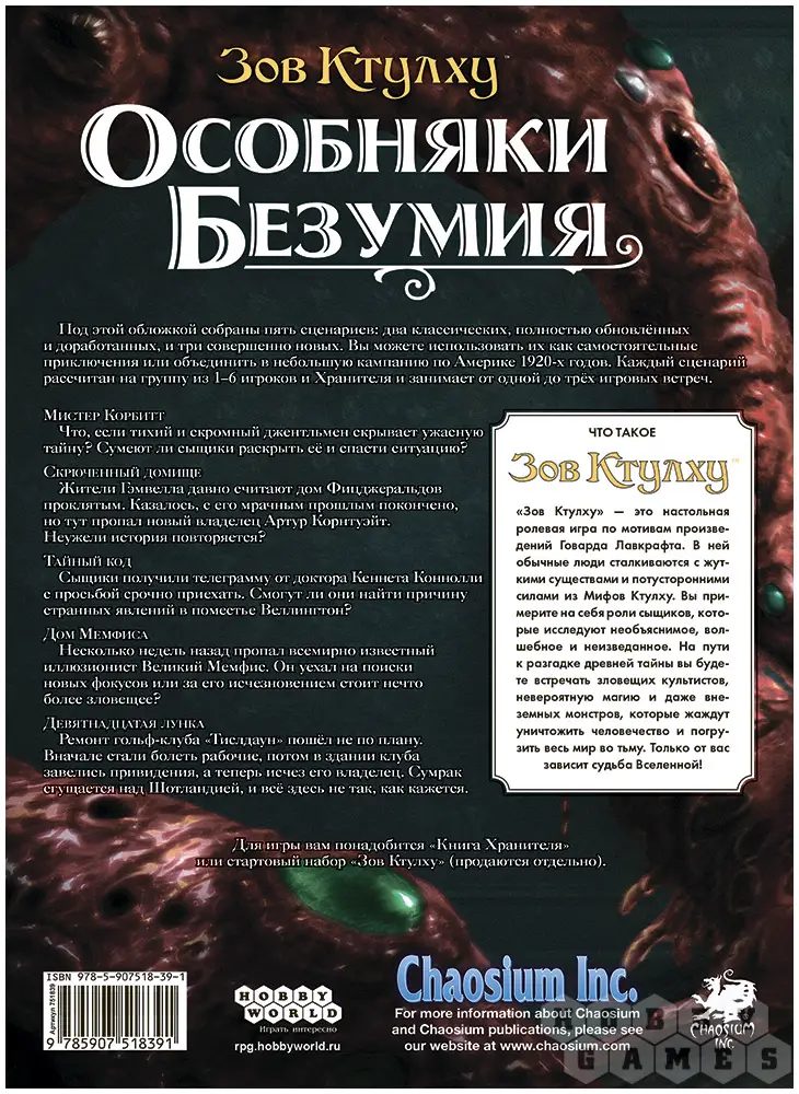 "Особняки безумия. За закрытыми дверями" – это собрание из 5 сценариев для вашей компании сыщиков. 2 из них уже стали классикой, но были полностью обновлены и доработаны, а остальные 3 вы ранее нигде не встречали. Каждый из них является самостоятельным и повествует свою историю странного и необъяснимого. Но при желании вы с лёгкостью можете объединить их в одну кампанию. Так что за сценарии вас ждут: