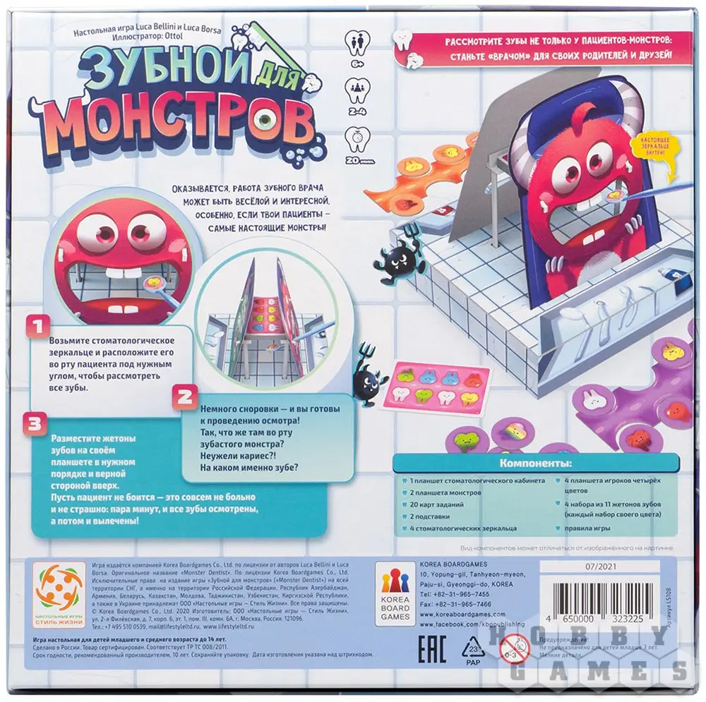 Правила настольной игры "Зубной для монстров" просты – возьмите стоматологическое зеркальце и расположите его во рту монстра-пациента под нужным углом, чтобы рассмотреть все зубы. Немного сноровки – и вы готовы к проведению осмотра. Так, ну и что же там во рту у зубастого монстра? Неужели кариес? А на каком зубе? Рассмотрев пасть монстрика, разместите жетоны зубов на своём планшете в нужном порядке и верной стороной вверх. Пусть пациент не боится – это совсем не больно и не страшно: всего пара минут, и вот уже все зубы осмотрены, а потом и вылечены.