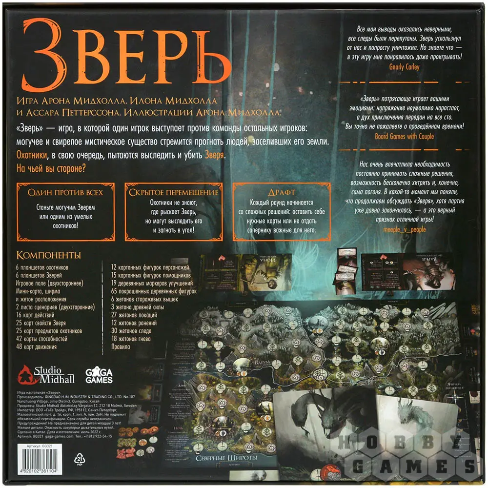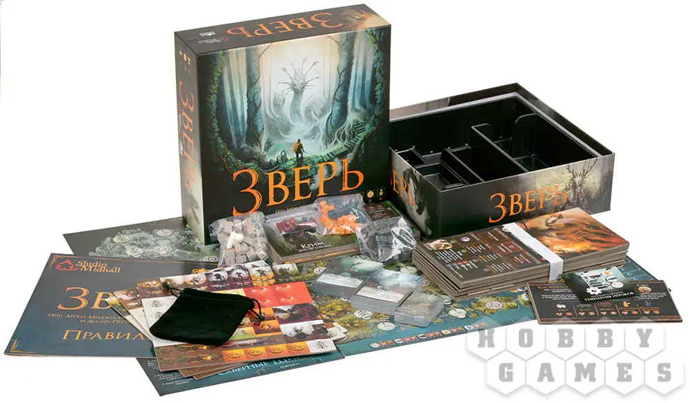 "Зверь" – это полукооперативная настольная игра, в которой часть игроков возьмёт на себя роль охотников и будет сражаться против одного игрока, управляющего Зверем. Задача Зверя – расправиться с определённым количеством поселенцев, в то время как охотники будут стараться ему помешать.
