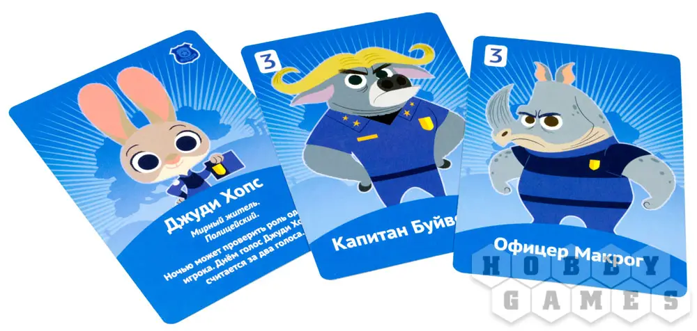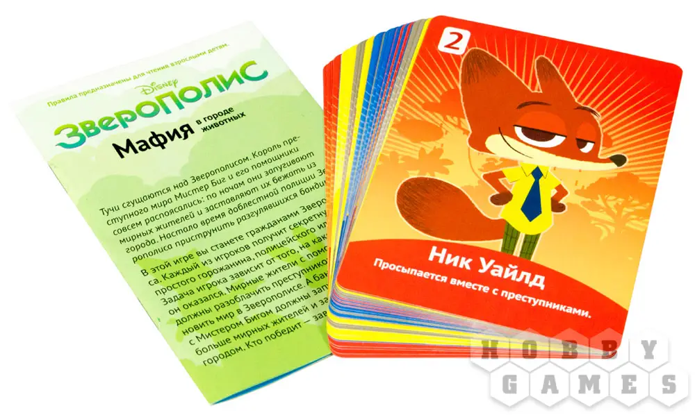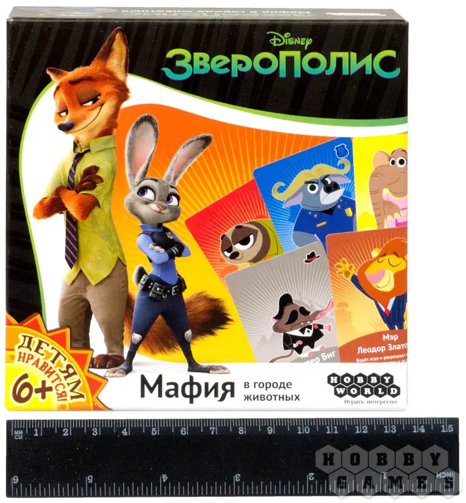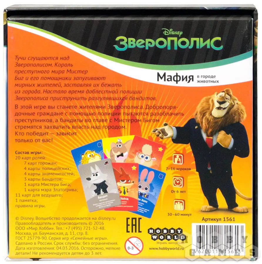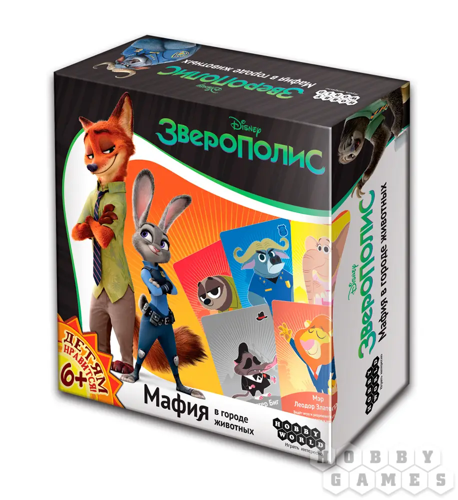 «Зверополис» — это интересная вариация на тему «Мафии», милая и красочная игра со знакомыми персонажами из мультика, каждый из которых обладает своей уникальной способностью. Данный вариант «Мафии» наиболее приближен к самому классическому варианту игры с ведущим. Все игроки получают уникальную роль персонажа из мультика. Это может быть горожанин, полицейский или бандит. Мирные жители с помощью бравых сотрудников полиции должны разоблачить преступников, а бандиты во главе с Мистером Бигом должны запугать как можно больше мирных жителей и захватить власть над городом. Всё как в «Мафии», то с ярким и дружелюбным уклоном, никаких казней и судов Линча.
