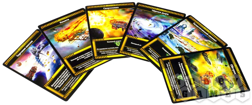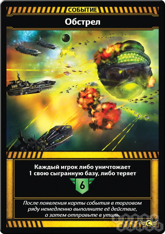 "События" – после появления карты события в торговом ряду немедленно выполняется её действие, а затем карта отправляется в утиль. Карту события нельзя купить, она никогда не попадает в вашу личную колоду
