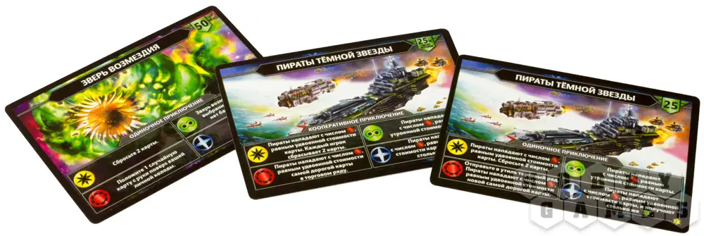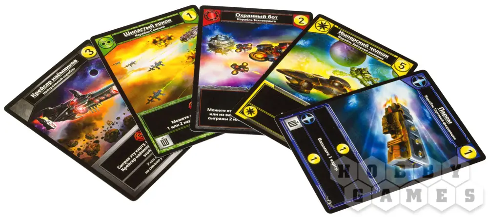 Карты обладают различными свойствами, которые применяются в различные фазы хода и дают вам уникальные бонусы или способности, на которых и будет построена ваша стратегия победы. С помощью карт приобретают очки боя, торговли или влияния – это ваши основные ресурсы на игру.