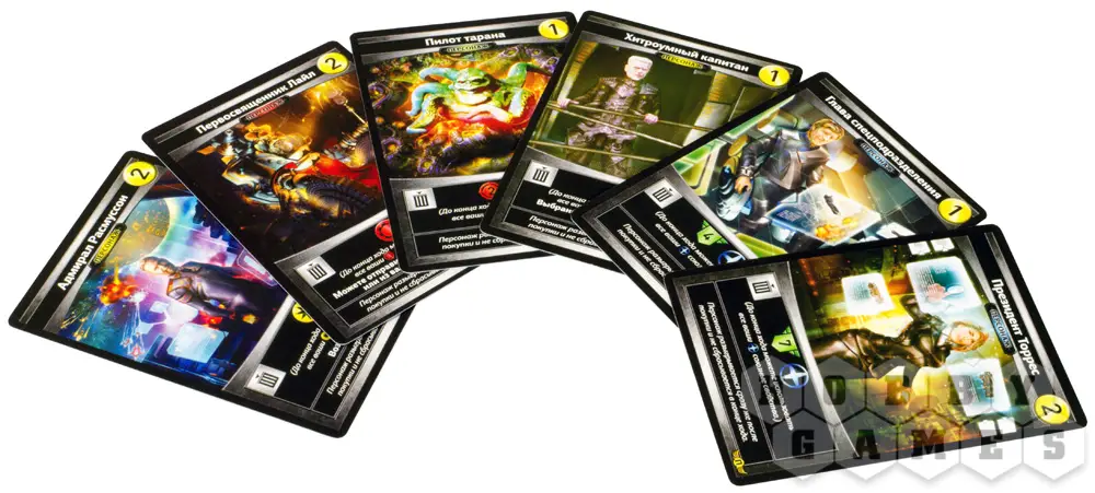 "Персонажи" – карты персонажей, появившиеся в торговом ряду, можно купить по тем же правилам, что и карты кораблей и баз. Однако после покупки персонаж не добавляется в ваш сброс, а сразу же разыгрывается